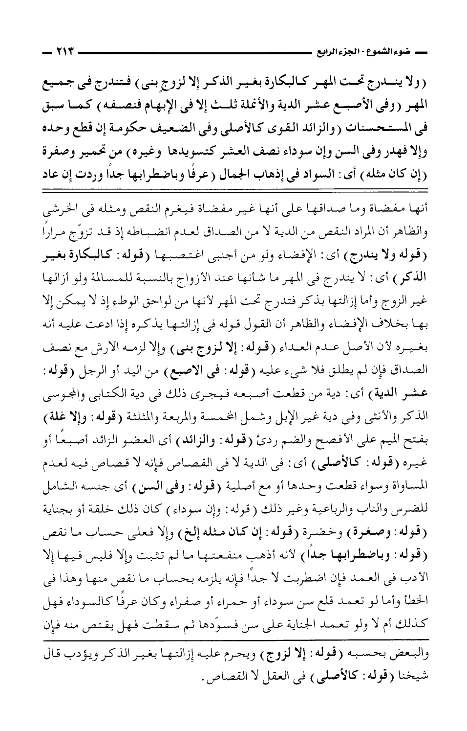(ولا يندرج تحت المهر كالبكارة بغير الذكر إلا لزوج بني) فتندرج في جميع المهر (وفي الأصبع عشر الدية والأنملة ثلث إلا في الإبهام فنصفه) كما سبق في المستحسنات (والزائد القوي كالأصلي وفي الضعيف حكومة إن قطع وحده وإلا فهدر وفي السن وإن سوداء نصف العشر كتسويدها وغيره) من تحمير وصفرة (إن كان مثله) أي: السواد في إذهاب الجمال (عرفاً وباضطرابها جداً وردت إن عاد