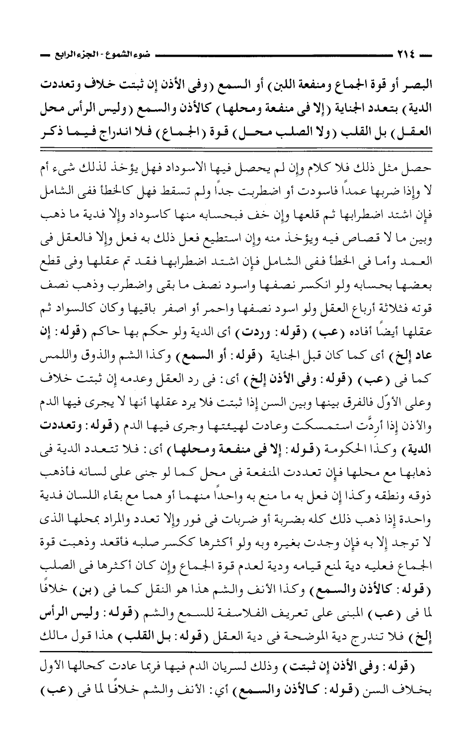 حصل مثل ذلك فلا كلام وإن لم يحصل فيها الاسوداد فهل يؤخذ لذلك شيء أم لا وإذا ضربها عمداً فاسودت أو اضطربت جداً ولم تسقط فهل كالخطأ ففي الشامل فإن اشتد اضطرابها ثم قلعها وإن خف فبحسابه منها كاسوداد وإلا فدية ما ذهب وبين ما لا قصاص فيه ويؤخذ منه وإن استطيع فعل ذلك به فعل وإلا فالعقل في العمد وأما في الخطأ ففي الشامل فإن اشتد اضطرابها فقد تم عقلها وفي قطع بعضها بحسابه ولو انكسر نصفها واسود نصف ما بقى واضطرب وذهب نصف قوته فثلاثة أرباع العقل ولو اسود نصفها واحمر أو اصفر باقيها وكان كالسواد ثم عقلها أيضًا أفاده (عب) (قوله: وردت) أي الدية ولو حكم بها حاكم (قوله: إن عاد إلخ) أي كما كان قبل الجناية (قوله: أو السمع) وكذا الشم والذوق واللمس كما في (عب) (قوله: وفي الإذن إلخ) أي في رد العقل وعدمه إن ثبتت خلاف وعلى الأول فالفرق بينها وبين السن إذا ثبتت فلا يرد عقلها أنها لا يجري فيها الدم والأذن إذا أرِدت استمسكت وعادت لهيئتها وجرى فيها الدم (قوله: وتعددت الدية) وكذا الحكومة (قوله: إلا في منفعة ومحلها) أي: فلا تتعدد الدية في ذهابها مع محلها فإن تعددت المنفعة في محل كما لو جنى على لسانه فأذهب ذوقه ونطقه وكذا إن فعل به ما منع به واحداً منهما أو هما مع بقاء اللسان فدية واحدة إذا ذهب ذلك كله بضربة أو ضربات في فور وإلا تعدد والمراد بمحلها الذي لا توجد إلا به فإن وجدت بغيره وبه ولو أكثرها ككسر صلبه فأقعد وذهبت قوة الجماع فعليه دية لمنع قيامه ودية لعدم قوة الجماع وإن كان أكثرها في الصلب (قوله: كالأذن والسمع) وكذا الأنف والشم هذا هو النقل كما في (بن) خلافاً لما في (عب) المبنى على تعريف الفلاسفة للسمع والشم (قوله: وليس الرأس إلخ) فلا تندرج دية الموضحة في دية العقل (قوله: بل القلب) هذا قول مالك