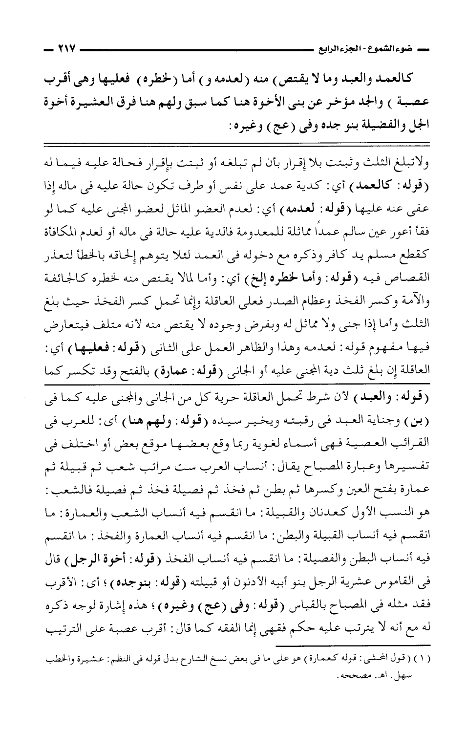ولا تبلغ الثلثِ وثبتت بلا إقرار بأن لم تبلغه أو ثبتت بإقرار فحالة عليه فيما له (قوله: كالعمد) أي: كنية عمد على نفس أو طرف تكون حالة عليه في ماله إذا عفى عنه عليها (قوله: لعدمه) أي: لعدم العضو المائل لعضو المجنى عليه كما لو فقأ أعور عين سالم عمداً مماثلة للمعدومة فالدية عليه حالة في ماله أو لعدم المكافأة كقطع مسلم يد كافر وذكره مع دخوله في العمد لئلا يتوهم إلحاقه بالخطأ لتعذر القصاص فيه (قوله: وأما لخطره إلخ) أي: وأما لمالا يقتص منه لخطره كالجائفة والآمة وكسر الفخذ وعظام الصدر فعلى العاقلة وإنما تحمل كسر الفخذ حيث بلغ الثلث وأما إذا جنى ولا مماثل له وبفرض وجوده لا يقتص منه لأنه متلف فيتعارض فيها مفهوم قوله: لعدمه وهذا والظاهر العمل على الثاني (قوله: فعليها) أي: العاقلة إن بلغ ثلث دية المجني عليه أو الجاني (قوله: عمارة) بالفتح وقد تكسر كما