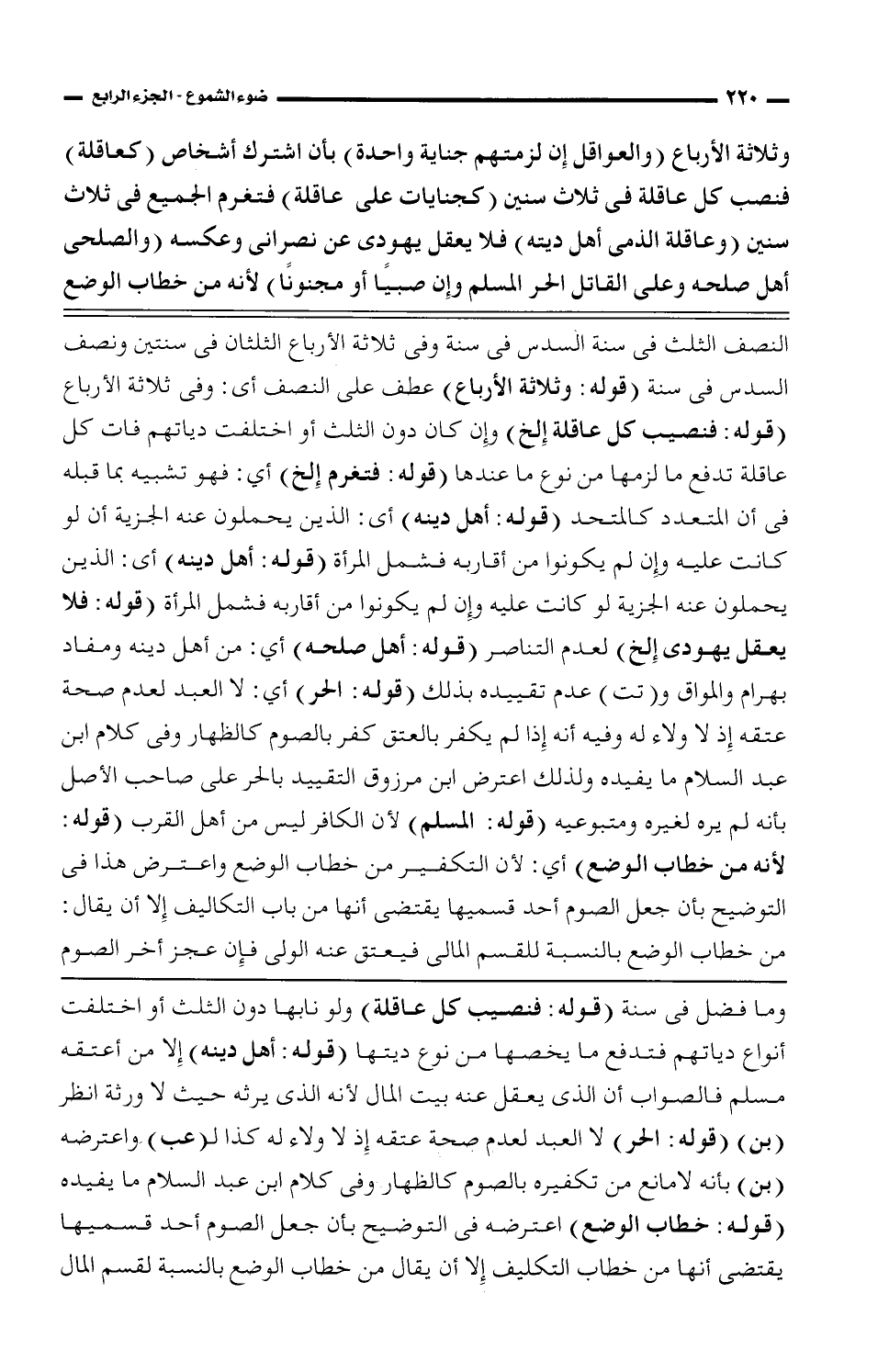 النصف الثلث في سنة السدس في سنة وفي ثلاثة الأرباع الثلثان في سنتين ونصف السدس في سنة (قوله: وثلاثة الأرباع) عطف على النصف أي: وفي ثلاثة الأرباع (قوله: فنصيب كل عاقلة إلخ) وإن كان دون الثلث أو اختلفت دياتهم فات كل عاقلة تدفع ما لزمها من نوع ما عندها (قوله: فتغرم إلخ) أي: فهو تشبيه بما قبله في أن المتعدد كالمتحد (قوله: أهل دينه) أي: الذين يحملون عنه الجزية أن لو كانت عليه وإن لم يكونوا من أقاربه فشمل المرأة (قوله: فلا يعقل يهودي إلخ) لعدم التناصر (قوله أهل صلحه) أي: من أهل دينه ومفاد بهرام المواق و (تت) عدم تقييده بذلك (قوله: الحر) أي: لا العبد لعدم صحة عتقه إذ لا ولاء له وفيه أنه إذا لم يكفر بالعتق كفر بالصوم كالظهار وفي كلام ابن عبد السلام ما يفيده ولذلك اعترض ابن مرزوق التقييد بالحر على صاحب الأصل بأنه لم يره لغيره ومتبوعيه (قوله: المسلم) لأن الكافر ليس من أهل القرب (قوله: لأنه من خطاب الوضع) أي: لأن التكفير من خطاب الوضع واعترض هذا في التوضيح بأن جعل الصوم أحد قسميها يقتضي أنها من باب التكاليف إلا أن يقال: من خطاب الوضع بالنسبة للقسم المالي فيعتق عنه الولى فإن عجز أخر الصوم