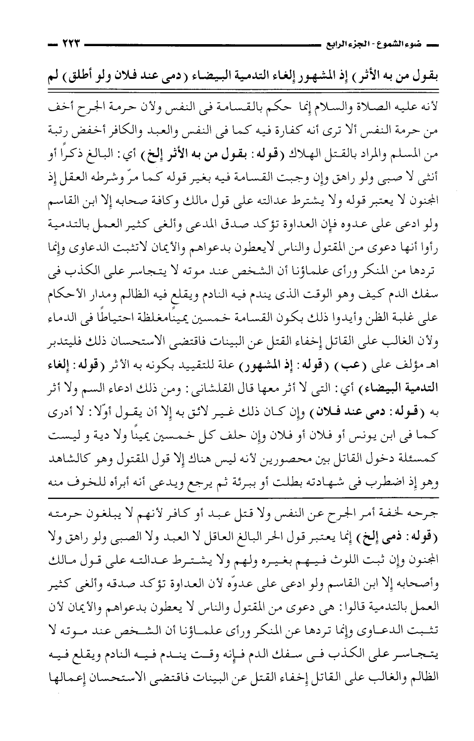 لأنه عليه الصلاة والسلام إنما حكم بالقسامة فى النفس ولأن حرمة الجرح أخف من حرمة النفس ألا ترى أنه كفارة فيه كما فى النفس والعبد والكافر أخفض رتبة من المسلم والمراد بالقتل الهلاك (قوله: بقول من به الأثر إلخ) أي: البالغ ذكراً أو أنثى لا صبى ولو راهق وإن وجبت القسامة فيه بغير قوله كما مر وشرطه العقل إذ المجنون لا يعتبر قوله ولا يشترط عدالته على قول مالك وكافة صحابه إلا ابن القاسم ولو ادعى على عدوه فإن العداوة تؤكد صدق المدعى وألغى كثير العمل بالتدمية رأو أنها دعوى من المقتول والناس لا يعطون بدعواهم والأيمان لا تثبت الدعاوى وإنما تردها من المنكر ورأى علماؤنا أن الشخص عند موته لا يتجاسر على الكذب فى سفك الدم كيف وهو الوقت الذى يندم فيه النادم ويقلع فيه الظالم ومدار الأحكام على غلبة الظن وأيدوا ذلك بكون القسامة خمسين يميناً مغلظة احتياطا فى الدماء ولأن الغالب على القاتل إخفاء القتل عن البينات فاقتضى الاستحسان ذلك فليتدبر أهـ مؤلف على (عب) (قوله: إذ المشهور) علة للتقييد بكونه به الأثر (قوله: إلغاء التدمية البيضاء) أى: التي لا أثر معها قال القلشانى: ومن ذلك ادعاء السم ولا أثر به (قوله: دمى عند فلان) وإن كان ذلك غير لائق به إلا أن يقول أولا: لا أدرى كما فى ابن يونس أو فلان أو فلان وإن حلف كل خمسين يميناً ولا دية وليست كمسئلة دخول القاتل بين محصورين لأنه ليس هناك إلا قول المقتول وهو كالشاهد وهو إذ اضطرب فى شهادته بطلت أو ببرئة ثم يرجع ويدعى أنه أبرأه للخوف منه\ ـــــــــــــــــــــــــــــــــــــــــ