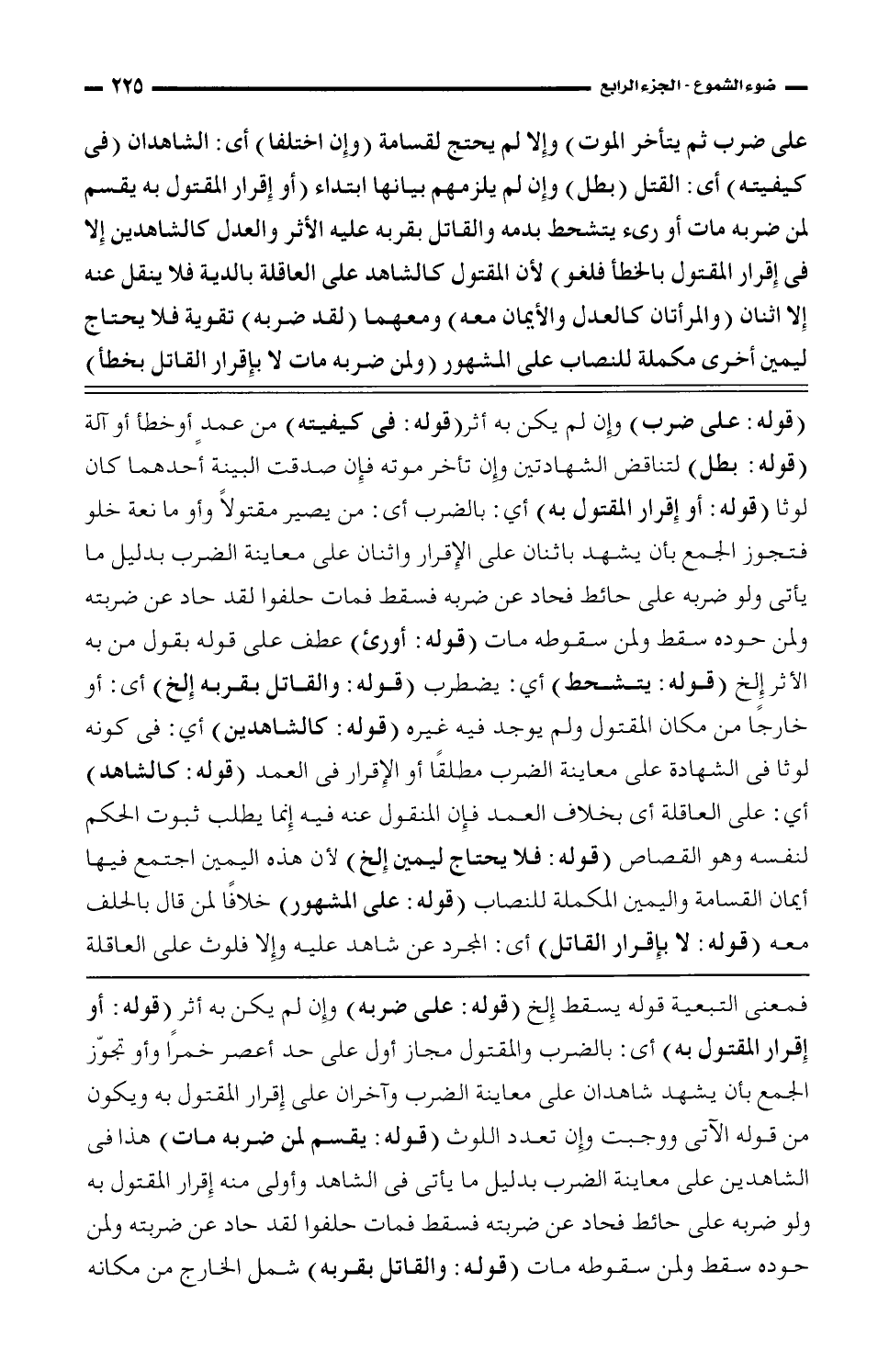 (قوله: على ضرب) وإن لم يكن به أثر (قوله: فى كيفيته) من عمد أو خطأ أو آلة (قوله: بطل) لتناقض الشهادتين وإن تأخر موته فإن صدقت البينة أحدهما كان لوثا (قوله: أو إقرار المقتول به) أي: بالضرب أي: من يصير مقتولاً واو مانعة خلو فتجوز الجمع بأن يشهد باثنان على الإقرار واثنان على معاينة الضرب بدليل ما يأتى ولو ضربه على حائط فحاد عن ضربه فسقط فمات حلفوا لقد حاد عن ضربته ولمن حوده سقط ولمن سقوطه مات (قوله: أو رئى) عطف على قوله بقول من به الأثر إلخ (قوله: يتشحط) أي: يضطرب (قوله: والقاتل بقربه إلخ) أى: أو خارجا من مكان المقتول ولم يوجد فيه غيره (قوله: كالشاهدين) أي: فى كونه لوثا فى الشهادة على معاينة الضرب مطلقاً أو الإقرار فى العمد (قوله: كالشاهد) أي: على العاقلة أى بخلاف العمد فإن المنقول عنه فيه إنما يطلب ثبوت الحكم لنفسه وهو القصاص (قوله: فلا يحتاج ليمين إلخ) لأن هذه اليمين اجتمع فيها أيمان القسامة واليمين المكملة للنصاب (قوله: على المشهور) خلافاً لمن قال بالحلف معه (قوله: لا بإقرار القاتل) أى: المجرد عليه وإلا فلوث على العاقلة