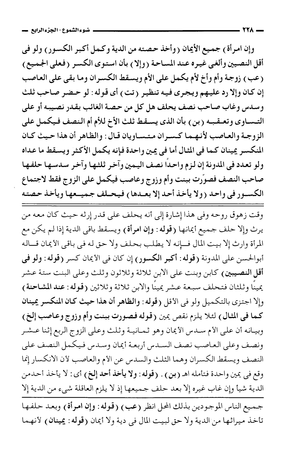 وإن امرأة) جميع الأيمان (وأخذ حصته من الدية وكمل أكبر الكسور) ولو فى أقل النصين وألغى غيره عند المساحة (وإلا) بأن استوى الكسر (فعلى الجميع) (عب) زوجة وأم وأخ لأم يكمل على الأم ويسقط الكسران وما بقى على العاصب إن كان وإلا رد عليهم ويجرى فيه تنظير (تت) أى قوله: لو حضر صاحب ثلث وسدس وغاب صاحب نصف يحلف هل كل من حصة الغائب بقدر نصيبه أو على التساوى وتعقبه (بن) بأن الذى يسقط ثلث الأخ للأم أم النصف فيكمل على الزوجة والعاصب لأنهما كسران متساويان قال: والظاهر أن هذا حيث كان المنكسر يمينان كما فى المثال أما فى يمين واحدة فإنه يكمل الأكثر ويسقط ما عداه ولو تعدد فى المدونة إن لزم واحداً نصف اليمين وآخر ثلثها وآخر سدسها حلفها صاحب النصف فصورت ببنت وأم وزوج وعاصب فيكمل على الزوج فقط لاجتماع الكسور فى واحد (ولا يأخذ أحد إلا بعدها) فيحلف جميعها ويأخذ حصته