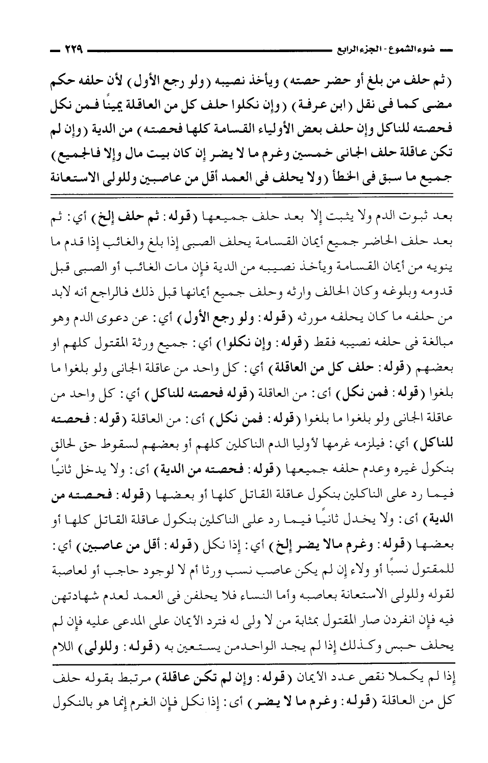 بعد ثبوت الدم ولا يثبت إلا بعد حلف جميعها (قوله: ثم حلف إلخ) أي: ثم بعد حلف الحاضر جميع أيمان القسامة يحلف الصبى إذا بلغ الغائب إذا قدم ما ينويه من أيمان القسامة ويأخذ نصيبه من الدية فإن مات الغائب أو الصبى قبل قدومه وبلوغه وكان الحالف وارثه وحلف جميع أيمانها قبل ذلك فالراجع أنه لابد من حلفه ما كان يحلفه مورثه (قوله: ولو رجع الأول) أى: عن دعوى الدم وهو مبالغه فى حلفه نصيبه فقط (قوله: وإن نكلوا) أي: جميع ورثة المقتول كلهم أو بعضهم (قوله: حلف كل من العاقلة) أي: كل واحد من عاقلة الجانى ولو بلغوا ما بلغوا (قوله: فمن نكل) أى: من العاقلة (قوله فحصته للناكل) أي: كل واحد من عاقلة الجانى ولو بلغوا (قوله: فمن نكل) أى: من العاقلة (قوله: فحصته للناكل) أي: فيلزمه غرمها لأوليت الدم الناكلين كلهم أو بعضهم لسقوط حق لحالق بنكول غيره وعدم حلفه جيمعها (قوله: فحصته من الدية) أى: ولا يدخل ثانيا فيما رد على الناكلين بنكول عاقلة القاتل كلها أو بعضها (قوله: فحصته من الدية) أى: ولا يخدل ثانياً فيما رد على الناكلين بنكول عاقلة القاتل كلها أو بعضها (قوله: وغرم مالا يضر إلخ) أي: إذا نكل (قوله: أقل من عاصبين) أي: للمقتول نسباً أو ولاء إن لم يكن عاصب نسبل ورثا أم لا لوجود حاجب أو لعاصبة لقوله وللولى الاستعانة بعاصبه وأما النساء فلا يحلفن فى العمد لعدم شهادتهن فيه فإن انفردن صار المقتول بمثابة من لا ولى له فترد الأيمان على المدعى عليه فإن لم يحلف حبس وكذلك إذا لم يجد الواحد من يستعين به (قوله: وللولى) اللام