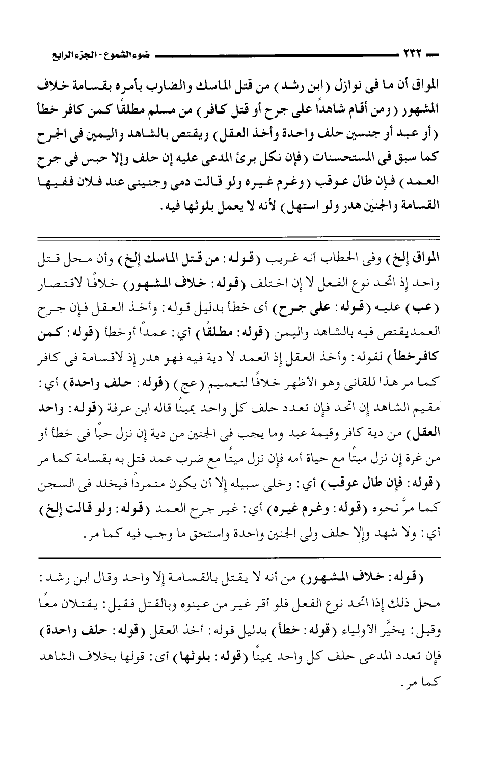 المواق أن ما في نوازل (ابن رشد) من قتل الماسك والضارب بأمره بقسامة خلاف المشهور (ومن أقام شاهداً على جرح أو قتل كافر) من مسلم مطلقاً كمن كافر خطأ (أو عبد أو جنسين حلف واحدة وأخذ العقل) ويقتص بالشاهد واليمين في الجرح كما سبق في المستحسنات (فإن نكل برئ المدعى عليه إن حلف وإلا حبس في جرح العمد) فإن طال عوقب (وغرم غيره ولو قالت دمى وجنيني عند فلان ففيها القسامة والجنين هدر ولو استهل) لأنه لا يعمل بلوثها فيه.