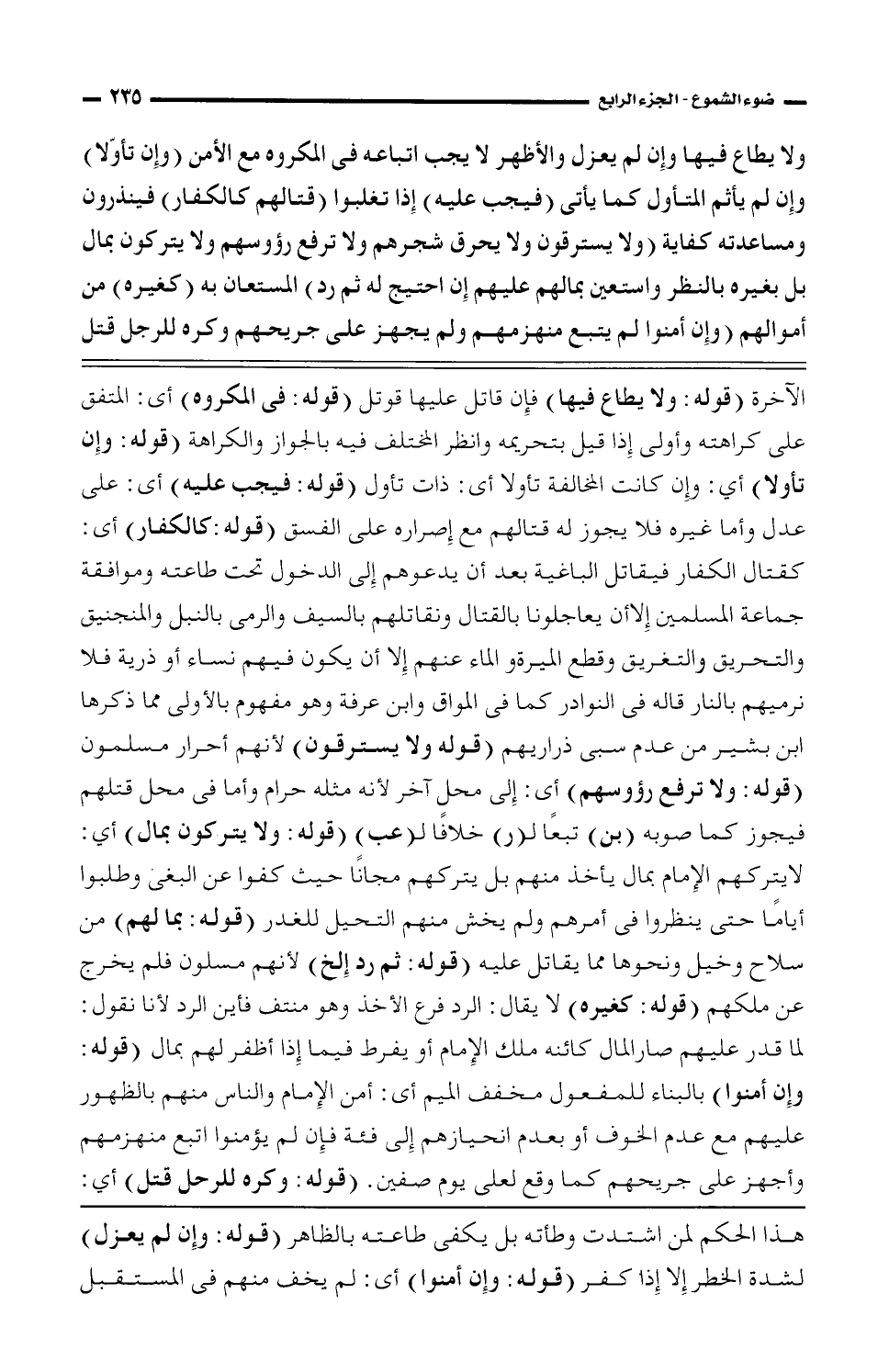 ولا يطاع فيها وإن لم يعزل والأظهر لا يجب اتباعه في المكروه مع الأمن (وإن تأولا) وإن لم يأثم المتأول كما يأتى (فيجب عليه) إذا تغلبوا (قتالهم كالكفار) فينذرون ومساعدته كفاية (ولا يسترقون ولا يحرق شجرهم ولا ترفع رؤوسهم ولا يتركون بمال بل بغيره بالنظر واستعين بمالهم عليهم إن احتيج له ثم رد) المستعان به (كغيره) من أموالهم (وإن أمنوا لم يتبع منهزمهم ولم يجهز على جريحهم وكره للرجل قتل