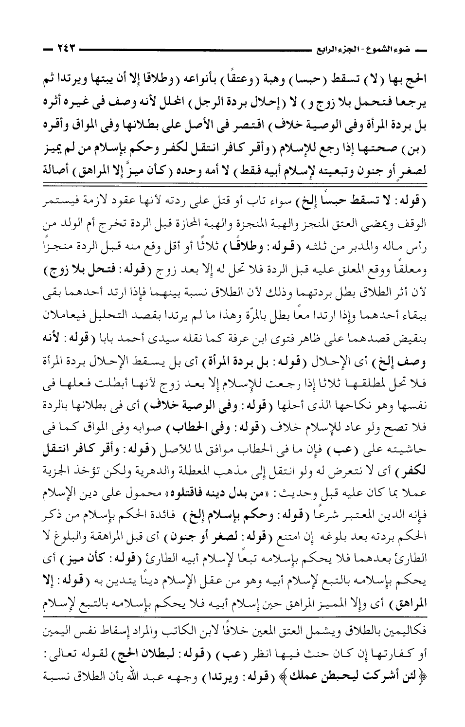 الحج بها (لا) تسقط (حبسا) وهبة (وعتقًا) بأنواعه (وطلاقا إلا أن يبتها ويرتدا ثم يرجعا فتحمل بلا زوج و) لا (إحلال بردة الرجل) المحلل لأنه وصف في غيره أثره بل بردة المرأة وفي الوصية خلاف) اقتصر في الأصل على بطلانها وفي المواق وأقره (بن) صحتها إذا رجع للإسلام (وأقر كافر انتقل لكفر وحكم بإسلام من لم يميز لصغر أو جنون وتبيعيته لإسلام أبيه فقط) لا أمه وحده (كأن ميز إلا المراهق) أصالة