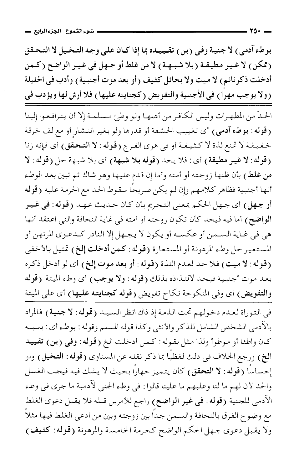 في التوراة لعدم دخولهم تحت الذمة إذ ذاك انظر السيد (قوله: لا جنية) فالمراد بالآدمي الشخص الشامل للذكر والأنثى وكذا قوله المسلم وقوله: بوطء أي: بسببه كان واطئا أو موطوأ ولذا مثل بقوله: كمن أدخلت الخ (قوله: التخيل) ولو إحساساً (قوله: لا التحقق) كأن يتميز جهارًا بحيث لا يشك فيه فيجب الغسل والحد لأن لهم ما لنا وعليهم ما علينا قالوا: في وطء الجني لآدمية ما جرى في وطء الآدمي للجنية (قوله: في غير الواضح) راجع للأمرين قبله فلا يقبل دعوى الغلط مع وضوح الفرق بالنحافة والسمن جدًا بين زوجته وبين من ادعى الغلط فيها مثلاً ولا يقبل دعوى جهل الحكم الواضح كحرمة الخامسة والمرهونة (قوله: كثيف)