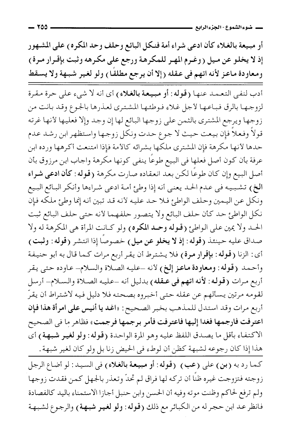 أدب لنفى التعمد عنها (قوله: أو مبيعة بالغلاء) أى أنه لا شئ على حرة مقرة ارزوجها بالرق فباعها لأجل غلاء فوطئها المشترى لعذرها بالجوع وقد بانت من زوجها ويرجع المشترى بالثمن على زوجها البائع لها إن وجد وإلا فعليها لأنها غرته قولاً وفعلاً فإن بيعت حيث لا جوع حدث ونكل زوجها واستظهر ابن رشد عدم حدها لأنها مركهة فإن المشترى ملكها بشرائه كالأمة فإذا امتنعت أكرهها ورده ابن عرفة بأن كون أصل فعلها في البيع طوعاً ينفى كونها مكرهة واجاب ابن مرزوق بأن أصل البيع وإن كان طوعاً لكن بعد انعقاده صارت مكرهة (قوله: كأن ادعى شراء الخ) تشبيه في عدم الحد يعنى أنه إذا وطئ أمة ادعى شراءها وأنكر البائع البيع ونكل عن اليمين وحلف الواطئ فلا حد عليه لأنه قد تبين أنه إنما وطئ ملكه فإن نكل الواطئ حد كأن حلف البائع ولا يتصور حلفهما لأنه حتى حلف البائع ثبت الحد ولا يمين على الواطئ (قوله وحد المكره) ولو كانت المرأة هي المكرهة له ولا صداق عليه حينئذ (قوله: إذ لا يخلو عن ميل) خصوصاً إذا انتشر (قوله: وثبت) أى: الزنا (قوله: بإقرار مرة) فلا يشترط أن يقر أربع مرات كما قال به أبو حنيفة وأحمد (قوله: ومعاودة ماعز إلخ) لأنه – عليه الصلاة والسلام – عاوده حتى يقر أربع مرات (قوله: لأنه اتهم فى عقله) بدليل أنه – عليه الصلاة والسلام – أرسل لقومه مرتين يسألهم عن عقله حتى أخبروه بصحته فلا دليل فيه لاشتراط أن يقر أربع مرات، وقد استدل لمذهب بخبر الصحيح: "اغد يا أنيس على امرأة هذا فإن اعترفت فارجمها فغدا إليها فاعترفت فأمر برجمها فرجمت" فظاهر ما فى الصحيح الاكتفاء بأقل ما يصدق اللفظ عليه وهو المرة الواحدة (قوله: ولو لغير شبهة) أى هذا إذا كان رجوعه لشبهة كظن أن لوطء في الحيض زنا بل ولو كان لغير شبهة.