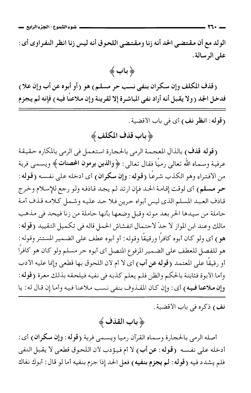 أصله الرمى بالحجارة وسماه القرآن رميا ويسمى قرية (قوله: وإن سكران) أى: أدخله على نفسه (قوله: عن أب) لا أم فيؤدب لأن اللحوق قطعى لا يقبل النفى فلم يشدد فيه (قوله: لم يجزم بنفيه) فعل الحد إذا جزم بنفيه أما لو قال: أبوك نفاك