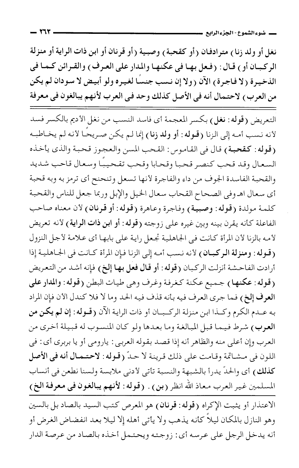 التعريض (قوله: نغل) بكسر المعجمة أى فاسد النسب من نغل الأديم بالكسر فسد لأنه نسب أمه إلى الزنا (قوله: أو ولد زنا) إنما لم يكن صريحاً لأنه لم يخاطبه (قوله: كفبحة) قال في القاموس: القحب المسن والعجوز قحبة والذى يأخذه السعال وقد قحب كنصر قحبا وقحابا وقحب تقحيباً وسعال قاحب شديد والقحبة الفاسدة الجوف من داء والفاجرة لأنها تسعل وتنحنح أى ترمز به وبه قحبة أى سعال اهـ وفى الصحاح القحاب سعال الخيل والإبل وربما جعل للناس والقحبة كلمة مولدة (قوله: وصبية) وفاجرة وعاهرة (قوله: أو قرنان) لأن معناه صاحب الفاعلة كأنه يقرن بينه وبين غيره على زوجته (قوله: أو ابن ذات الراية) لأنه تعريض لأمه بالزنا لأن المرأة كانت فى الجاهلية تجعل راية على بابها أى علامة لأجل النزول (قوله: ومنزلة الركبان) لأنه نسب أمه إلى الزنا فإن المرأة كانت فى الجاهلية إذا أرادت الفاحشة أنزلت الركبان (قوله: أو قال فعل بها إلخ) فإنه أشد من التعريض (قوله: عكنها) جميع عكنة كغرقة وغرف وهى طيات البطن (قوله: والمدار على العرف إلخ) فما جرى العرف فيه بأنه قذف فيه الحد وما لا فلا كندل الأن فإن المراد به عدم الكرم وكذا ابن منزلة الركبان أو ذات الراية الآن (قوله: إن لم يكن من العرب) شرط فيما قبل المبالغة وما بعدها ولو كان المنسوب له قبيلة أخرى من العرب وإن أعلى منه والظاهر أنه إذا قصد بقوله العربى: يا رومى أو يا بربرى أى: فى اللون فى مشاتمة وقامت على ذلك قرينة لا حد (قوله: لاحتمال أنه فى الأصل كذلك) أى والحد يردأ بالشبهة تأتى لأدنى ملابسة ولسنا نطعن فى أنساب المسلمين غيلا العرب معاذ الله انظر (بن). (قوله: لأنهم يبالغون فى معرفة الخ)
