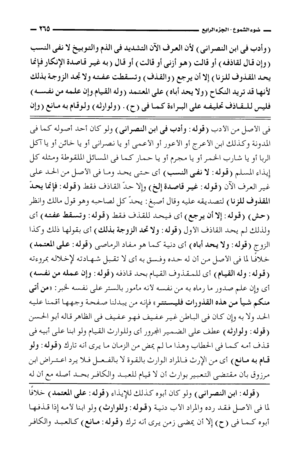فى الأصل من الأدب (قوله: وأدب فى ابن النصرانى) ولو كان أحد أصوله كما فى المدونة وكذلك ابن الأعرج أو الأعمى أو يا نصرانى أو يا خائن أو يا آكل الربا أو يا شارب الخمر أو يا مجزم أو يا حمار كما فى المسائل الملقوطة ومثله كل إيذاء المسلم (قوله: لا نفى النسب) أى حتى يحد وما فى الأصل من الحد على غير العرف الآن (قوله: غير قاصدة إلخ) وإلا حد القاذف فقط (قوله: فإنما يحد المقذوف للزنا) لتصدينه عليه وقال أصبغ: يحد كل لصاحبه وهو قول مالك وانظر (حش) (قوله: إلا أن برجع) أى فيحد للقذف فقط (قوله: وتسقط عفته) أى ولذلك لم يحد القاذف الأول (قوله: ولا تحد الزوجة بذلك) أى بقولها ذلك وكذا الزوج (قوله: ولا يحد أباه) أى دنية كما هو مفاد الرماصى (قوله: على المعتمد) خلافاً لما فى الأصل من له حده وفسق به أى لا تقبل شهادته لإخلاله بمروءته (قوله: وله القيام) أى للمقذوف القيام بحد قاذفه (قوله: وإن عمله من نفسه) أى وإن علم صدور ما رماه به من نفسه لأنه مأمور بالستر على نفسه لخبر: "من أتى منكم شيئاً من هذه القذورات فليستتر" فإنه من يبدلنا صفحة وجهها أقمنا عليه الحد ولا به وإن كان فى الباطن غير عفيف فى الظاهر قاله أبو الحسن (قوله: ولوارثه) عطف على الضمير المجرور أى وللوارث القيام ولو ابنا على أبيه فى قذف أمه كما فى الخطاب وهذا ما لم يمض من الزمان ما يرى أنه تارك (قوله: ولو قام به مانع) أى من الإرث فالمراد الوارث بالقوة لا بالفعل فلا يراد اعتراض ابن مرزوق بأن مقتضى التعبير بوارث أن لا قيام للعبد والكافر بحد بحد أصله مع أن له