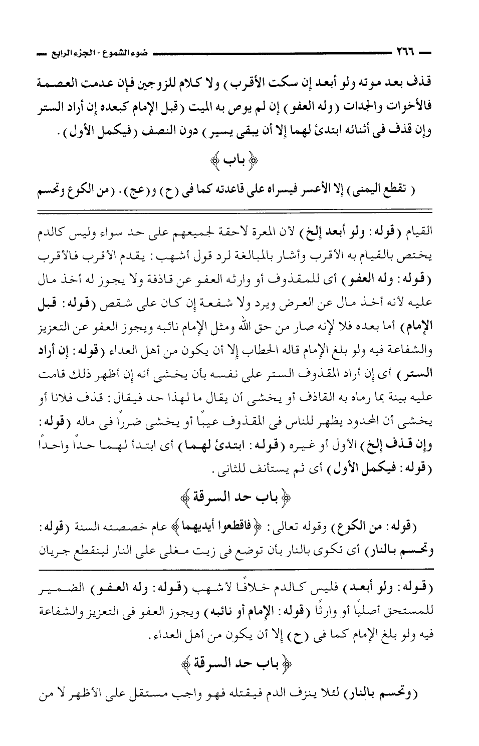 (قوله: من الكوع) وقوله تعالى: {فاقطعوا أيديهما} [المائدة: 38] عام خصصته السنة (قوله: وتحسم بالنار) أى تكوى بالنار بأن توضع فة زيت مغلى على النار فلينقطع جريان