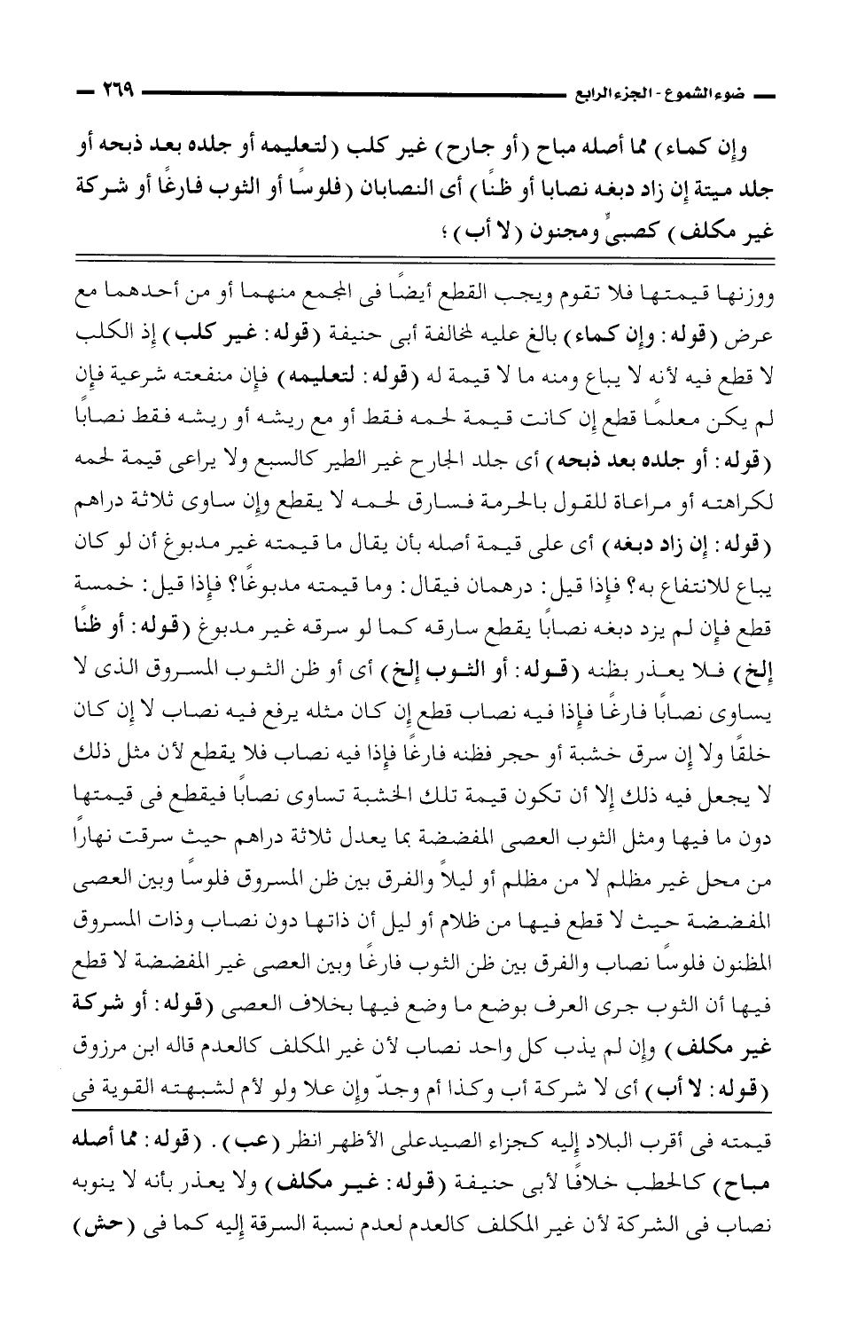 ووزنها قيمتها فلا تقوم ويجب القطع أيضاً فى المجمع منهما أو من أحدهما مع عرض (قوله: وإن كماء) بالغ عليه لمخالفة أبى حنيفة (قوله: غير كلب) إذ الكلب لا قطع فيه لأنه لا يباع ومنه لا قيمة له (قوله: لتعليمه) فإن منفعته شرعية فإن لم يكن معلماً قطع إن كانت قيمة لحمه فقط أو مع ريشه أو ريشه فقط نصاباً (قوله: أو جلده بعد ذبحه) أى جلد الجارح غير الطير كالسبع ولا يراعى قيمة لحمه لكراهته أو مراعاة للقول بالحرمة فسارق لحمه لا يقطع وإن ساوى ثلاثة دراهم (قوله: إن زاد دبغه) أى على قيمة أصله بأن يقال ما قيمته غير مدبوغ أن لو كان يباع للانتفاع به؟ فإذا قيل: درهمان فيقال: وما قيمته مدبوغاً؟ فإذا قيل: خمسة قطع فإن لم يزد دبغه نصاباً يقطع سارقه كما لو سرقه غير مدبوغ (قوله: أو ظناً إلخ) فلا يعذر بظنه (قوله: أو الثوب إلخ) أى أو ظن الثوب المسروق الذى لا يساوى نصاباً فارغاً فإذا فيه نصاب قطع إن كان مثله يرفع فيه نصاب لا إن كان خلقاً ولا إن سرق خشبة أو حجر فظنه فارغاً فإذا فيه نصاب فلا يقطع لأن مثل ذلك لا يجعل فيه ذلك إلا أن تكون قيمة تلك الخشبة تساوى نصاباً فيقطع فى قيمتها دون ما فيها ومثل الثوب العصى المفضفضة بما يعدل ثلاثة دراهم حيث سرقت نهارا من محل غير مظلم لا من مظلم أو ليلاً والفرق بين ظن المسروق فلوساً وبين العصى المفضفضة حيث لا قطع فيها من ظلام أو ليلاً أن ذاتها دون نصلب وذات المسروق المظنون فلوساً نصاب والفرق بيم ظن الثوب فارغاً وبين العصى غير المفضفضة لا قطع فيها أن الثوب جرى العرف بوضع ما وضع فيها بخلاف العصى (قوله: أو شركة غير مكلف) وإن لم يذب كل واحد نصاب لأن غير المكلف كالعدم قاله ابن مرزوق (قوله: لا أب) أى لا شركة أب وكذا أم وجد وإن علا ولو لأن لشبهته القوية فى