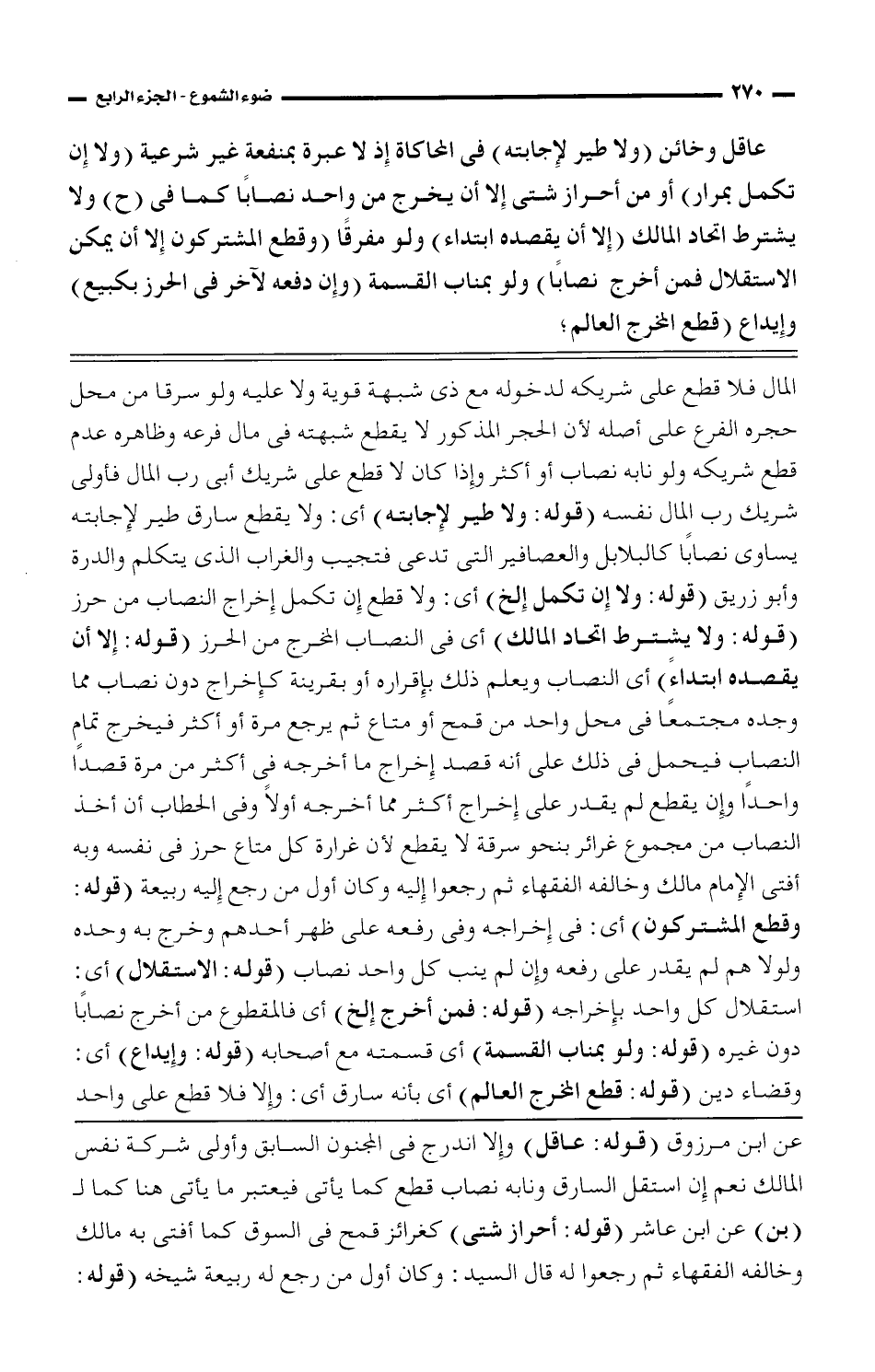 المال فلا قطع على شريكه لدخوله مع ذى شبهة قوية ولا عليه ولو سرقا من محل حجره الفرع على أصله لأن الحجر المذكور لا يقطع شبهته فى مال فرعه وظاهره عدم قطع شريكته ولو نابه نصاب أو أكثر وإذا كان لا قطع على شريك أبى رب المال فأولى شريك رب المال نفسه (قوله: ولا طير لإجابته) أى: ولا بقطع سارق طير لإجابته يساوى نصاباً كالبلابل والعصافير التى تدعى فتجيب ولاغراب الذى يتكلم والدرة وأبو زريق: (قوله: ولا إن تكمل إلخ) أى: ولا قطع أن تكمل إخراج النصاب من حرز (قوله: ولا إن تكمل إلخ) أى: ولا قطع إن تكمل إخراج النصاب من حرز (قوله: ولا يشترط اتحاد المالك) أى فى النصاب المخرج من الحرز (قوله: إلا أن يقصده ابتداء) أى النصاب ويعلم ذلك بإقراره أو بقرينة كإخراج دون نصاب مما وجده مجتمعاً فى محل واحد من قمح أو متاع ثم يرجع مرة أو أكثر فيخرج تمام النصاب فيحمل فى ذلم على أنه قصد إخراج ما أخرجه فى أكثر من مرة قصداً واحداً وإن لم يقطع لم يقد على إخراج أكثر مما أخرجه أولاً وفى الحطاب أن أخذ النصاب من مجموع غرائز بنحو سرقة لا يقطع لأن غرارة كل متاع حرز فى نفسه وبه أفتى الإمام مالك وخالفه الفقهاء ثم راجعوا إليه وكان أول من رجع إليه ربيعة (قوله: وقطع المشتركون) أى: فى إخراجه وفى رفعه على ظهر أحدهم وخرج به وحده ولولا هم لم يقدر على رفعه وإن لم ينب كل واحد نصاب (قوله: الاستقلال) أى: استقلال كل واحد بإخراجه (قوله: فمن أخرج إلخ) أى فالمقطوع من أخرج نصاباً دون غيره (قوله: ولو بمناب القسمة) أى قسمته مع أصحابه (قوله: وإبداع) أى: وقضاء دين (قوله: قطع المخرج العالم) أى بأنه سارق أى: وإلا فلا قطع على واحد
