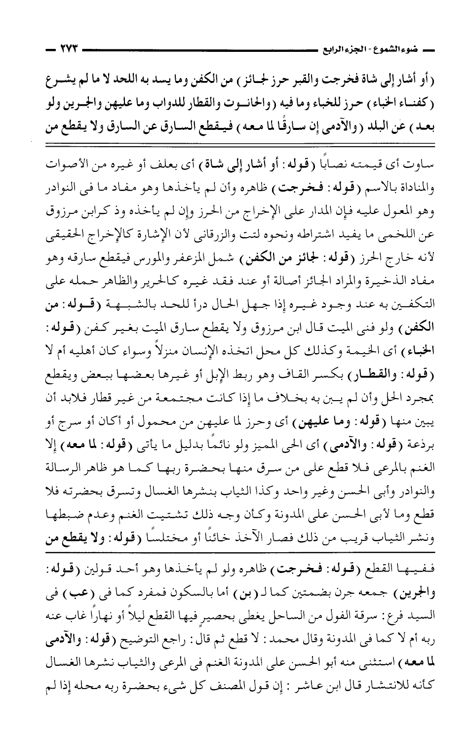 ساوت أى قيمته نصاباً (قوله: أو أشار إلى شاة) أى يعلف أو غيره من الأصوات والمناداة بالاسم (قوله: فخرجت) ظاهره وأن لم يأخذها وهو مفاد ما فى النوادر وهو المعول عليه فإن المدار على الإخراج من الحرز وإن لم يأخذه وذ كرابن مرزوق عن اللخمى ما يفيد اشتراطه ونحوه لتت والزرقانى لأن الإشارة كالإخراج الحقيقى لأنه خارج الحرز (قوله: لجائز من الكفن) شمل المزعفر والمورس فيقطع سارقه وهو مفاد الذخيرة والمراد الجائز أصالة أو عند فقد غيره كالحرير والظاهر حمله على التكفين به عند وجود غيره إذا جهل الحال درأ للحد بالشبهة (قوله: من الكفن) ولو فنى الميت قال ابن مرزوق ولا يقطع سارق الميت بغير كفن (قوله: من الكفن) ولو فنى الميت قال ابن مرزوق ولا قطع سارق الميت بغير كفن (قوله: الخباء) أى الخيمة وكذلك كل محل اتخذه الإنسان منزلاً وسواء كان أهليه أم لا (قوله: والقطار) بكسر القاف وهو ربط الإبل أو غيرها بعضها ببعض ويقطع بمجرد الحل وأن لم يبن به بخلاف ما إذا كانت مجتمعة من غير قطار فلابد أن يبين منها (قوله: وما عليهن) أى وحرز لما عليهن من محمول أو أكان أو سرج أو برذعة (قوله: والآدمى) أى الحى المميز ولو نائماً بدليل ما يأتى (قوله: لما معه) إلا الغنم بالمرعى فلا قطع على من سرق منها بحضرة ربها كما هو ظاهر الرسالة والنوادر وأبى الحسن وغير واحد وكذا الثياب بنشرها الغسال وتسرق بحضرته فلا قطع وما لأبى الحسن على المدونة وكأن وجه ذلك تشتيت الغنم وعدم ضبطها ونشر الثياب قريب من ذلك فصار الآخذ خائناً أو مختلساً (قوله: ولا يقطع من