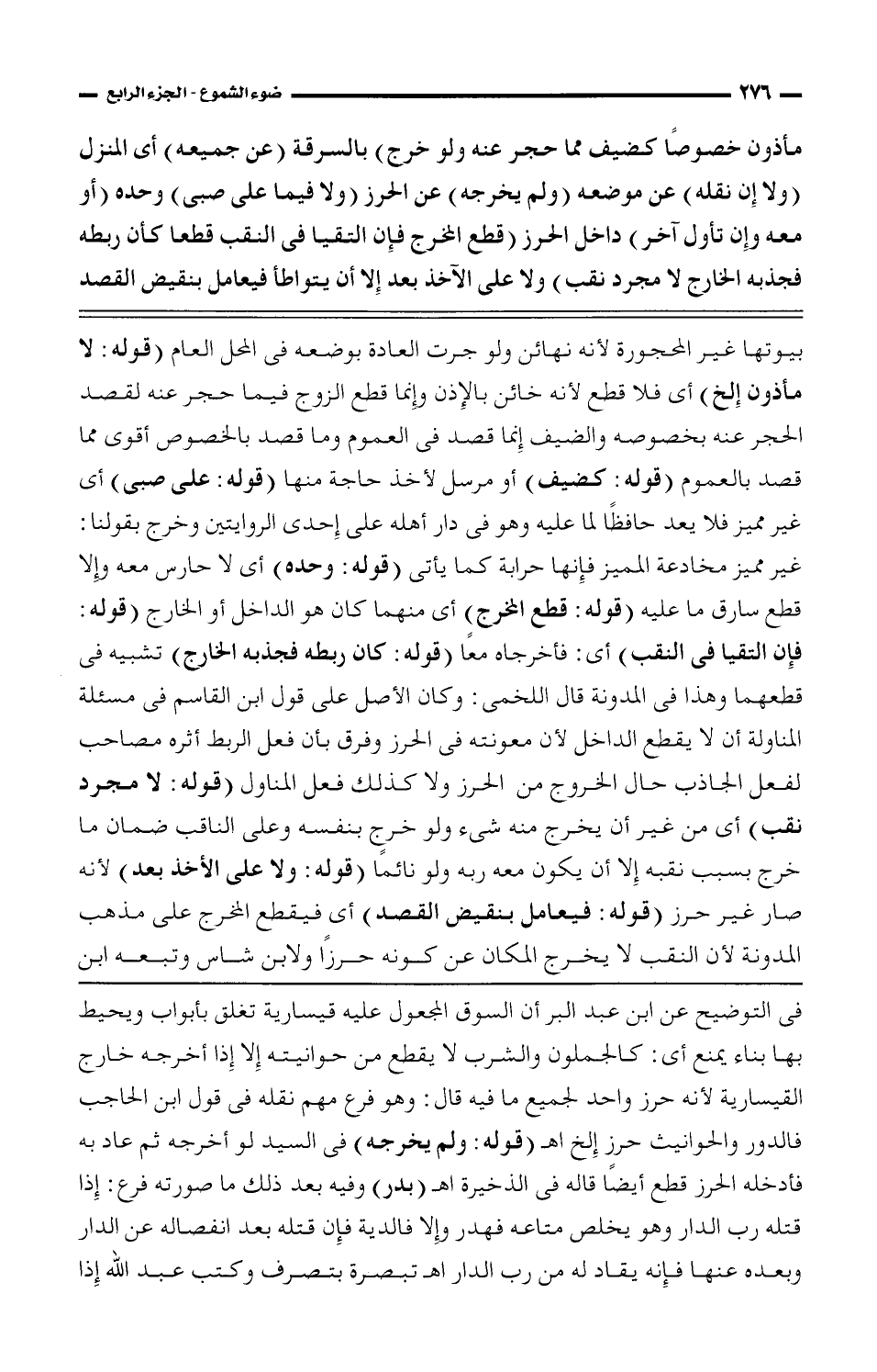 بيوتها غير المحجورة لأنه نهائن ولو جرت العادة بوضعه فى المحل العام (قوله: لا مأذون إلخ) أى فلا قطع لأنه خائن بالإذن وإنما قطع الزوج فيما حجر عنه لقصد الحجر عنه بخصوصه والضيف إنما قصد فى العموم وما قصد بالخصوص أقوى مما قصد بالعموم (قوله: كضيف) أو مرسل لأخذ حاجة منها (قوله: على صبى) أى غير مميز فلا يعد حافظاً لما عليه وهو فى دار أهله على إحدى الروايتين وخرج بقولنا: غير مميز مخادعة المميز فإنها حرابة كما يأتى (قوله: وحده) أى لا حارس معه وإلا قطع سارق ما عليه (قوله: قطع المخرج) أى منهما كان هو الداخل أو الخارج (قوله: فإن التقيا فى النقب) أى: فأخرجاه معاً (قوله: كان ربطه فجذبه الخارج) تشبيه فى قطعهما وهذا فى المدونة قال اللخمى: وكان الأصل على قول ابن القاسم فى مسئلة المناولة أن لا يقطع الداخل لأن معونته فى الحرز وفرق بأن فعل الربط أثره مصاحب لفعل الجاذب حال الخروج من الحرز ولا كذلك فعل المناول (قوله: لا مجرد نقب) أى من غير أن يخرج منه شئ ولو خرج بنفسه وعلى الناقب ضمان ما خرج بسبب نقبه إلا أن يكون معه ربه ولو نائماً (قوله: ولا على الأخذ بعد) لأنه صار غير حرز (قوله: فيعامل بنقيض القصد) أى فيقطع المخرج على مذهب المدونة لأن النقب لا يخرج المكان عن كونه حرزاً ولابن شاس وتبعه ابن
