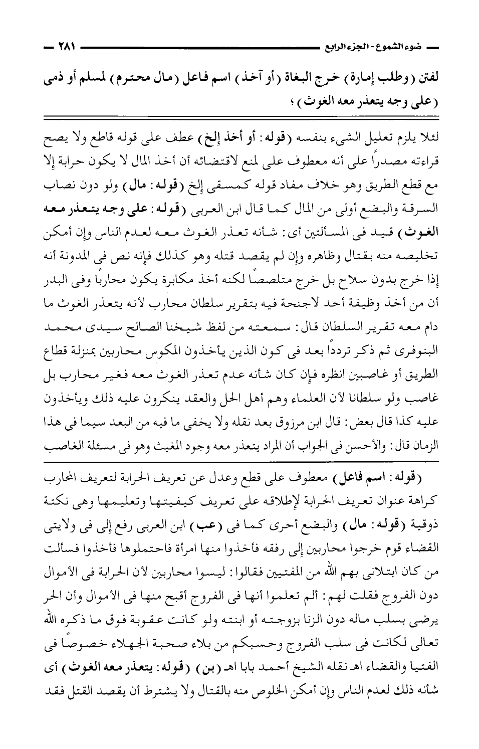 لفتن (وطلب إمارة) خرج البغاة (أو آخذ) اسم فاعل (مال محترم) لمسلم أو ذمى (على وجه يتعذر منه الغوث)؛