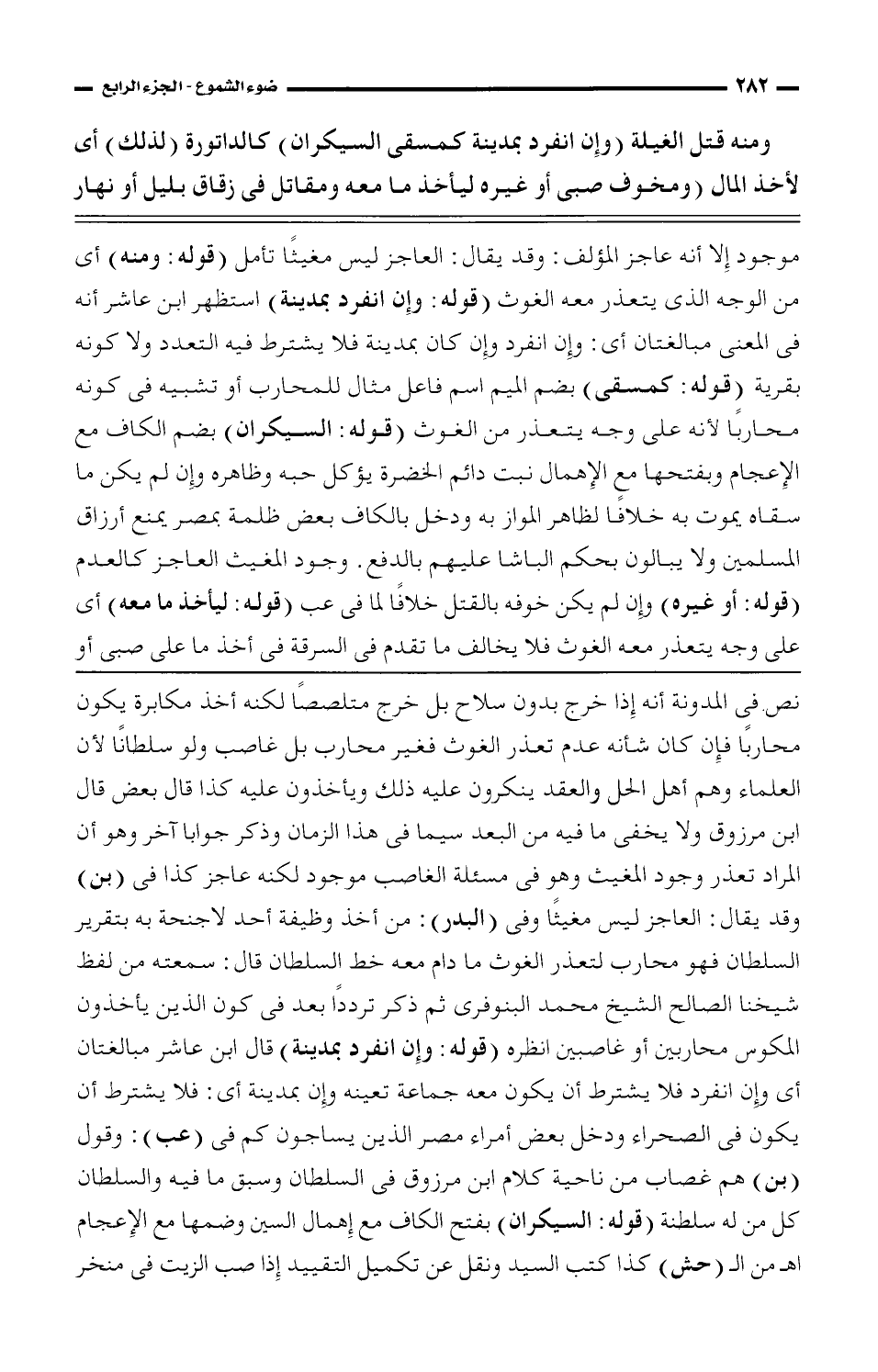 نص فى المدونة أنه إذا أخرج بدون سلاح بل خرج متلصصاً لكنه أخذ مكابرة يكون محارباً فإن كان شأنه عدم تعذر الغوث فغير محارب بل غاصب ولو سلطاناً لأن العلماء وهو أهل الحل والعقد ينكرون عليه ذلك ويأخذون عليه كذا قال بعض قال ابن مرزوق ولا يخفى ما فيه من البعد سيما فى هذا الزمان وذكر جواباً آخر وهو أن المراد تعذر وجوب المغيث وهو فى مسألة الغاصب موجود لكنه عاجز كذا فى (بن) وقد يقال: العاجز ليس مغيثاً وفى (البدر): من أخذ وظيفة أحد لا جنحة بتقرير السلطان فهو محارب لتعذر الغوث ما دام معه خط السلطان قال: سمعته من لفظ شيخنا الصالح الشيخ محمد البنوفرى ثم ذكر تردداً بعد فى كون الذين يأخذون المكوس محاربين أو غاصبين انظره (قوله: وإن انفرد يمدينة) قال ابن عاشر مبالغتان أى وإن انفرد فلا يشترط أن يكون معه جماعة تعينه وإن بمدينة أى: فلا يشترط أن يكون فى الصحراء ودخل بعض أمراء مصر الذين يساجون كم فى (عب): وقول (بن) هم غصاب من ناحية كلام ابن مرزوق فى السلطان وسبق ما فيه والسلطان كل من له سلطنة (قوله: السيكران) بفتح الكاف مع إهمال السين وضمها مع الإعجام اهـ من الـ (حش) كذا كتب السيد ونقل عن تكميل التقييد إذا صب الزيت فى منخر