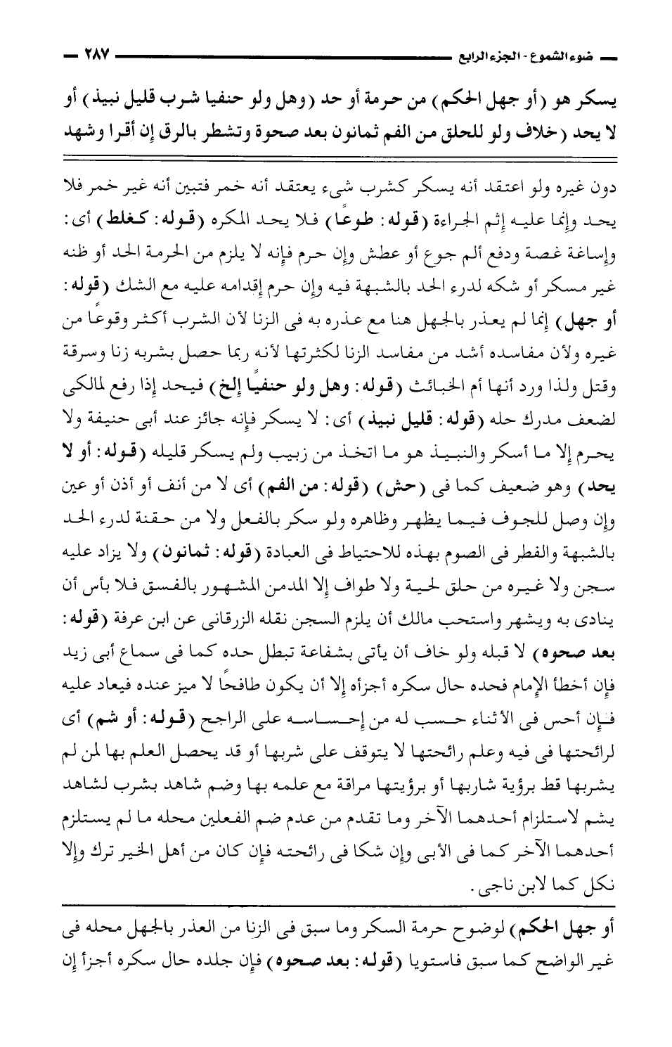 أو جهل الحكم) لوضوح حرمة السكر وما سبق فى الزما من العذر بالجهل محله فى غير الواضح كما سبق فاستويا (قوله: بعد صحوه) فإن جلده حال سكره أجزأ إن