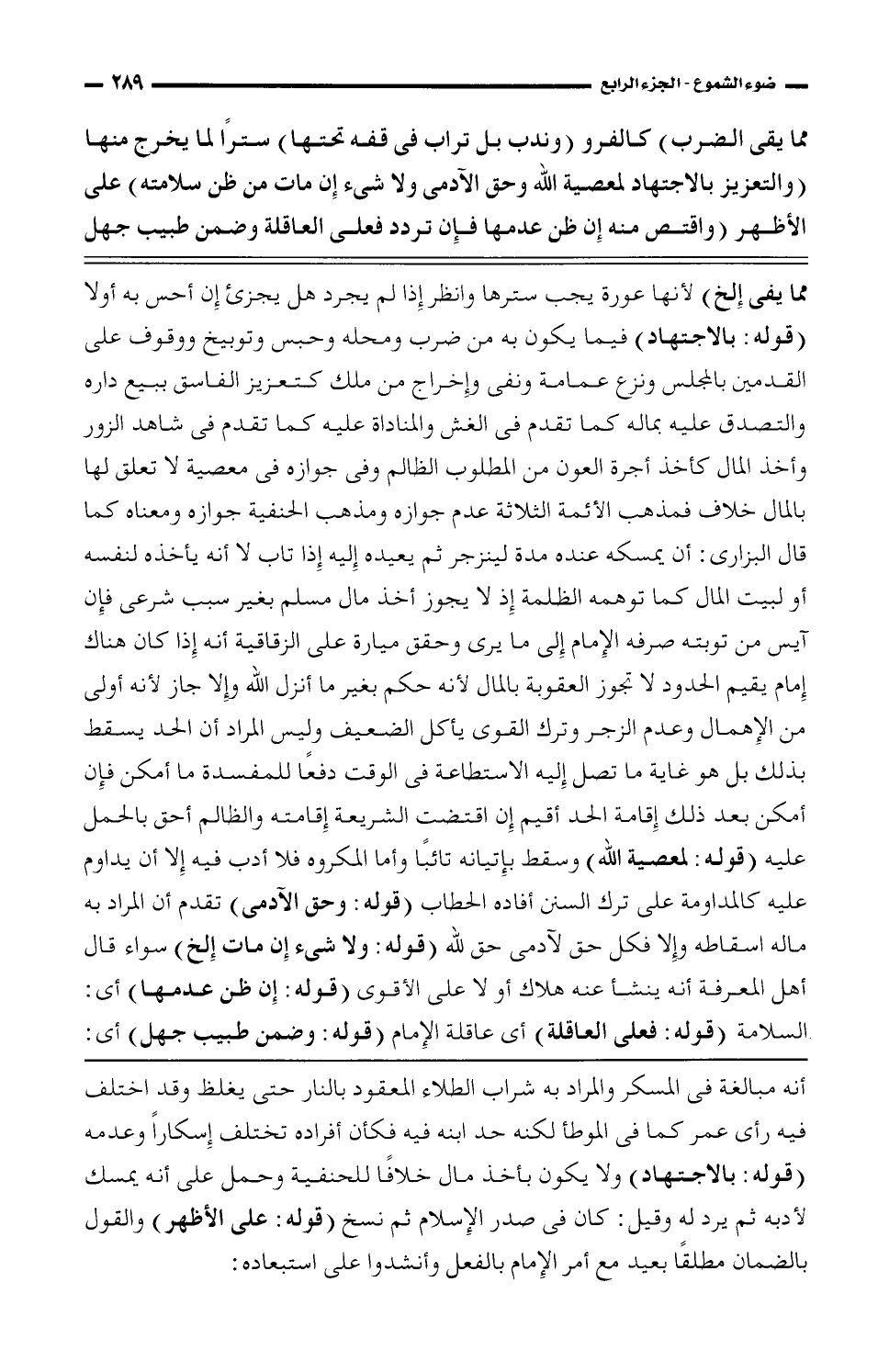 أنه مبالغة فى المسكر والمراد به شراب الطلاء المعقود حتى يغلظ وقد اختلف فيه رأى عمر كما فى الموطأ لكنه حد ابنه فيه فكان أفراده تختلف إسكاراً وعدمه (قوله: بالاجتهاد) ولا يكون بأخذ مال خلافاً للحنفية وحمل على أنه يمسك لأدبه ثم يرد له وقيل: كان فى صدر الإسلام ثم نسخ (قوله: على الأظهر) والقول بالضمان مطلقاً بعيد مع أمر الإمام بالفعل وأنشدوا على استبعاده: