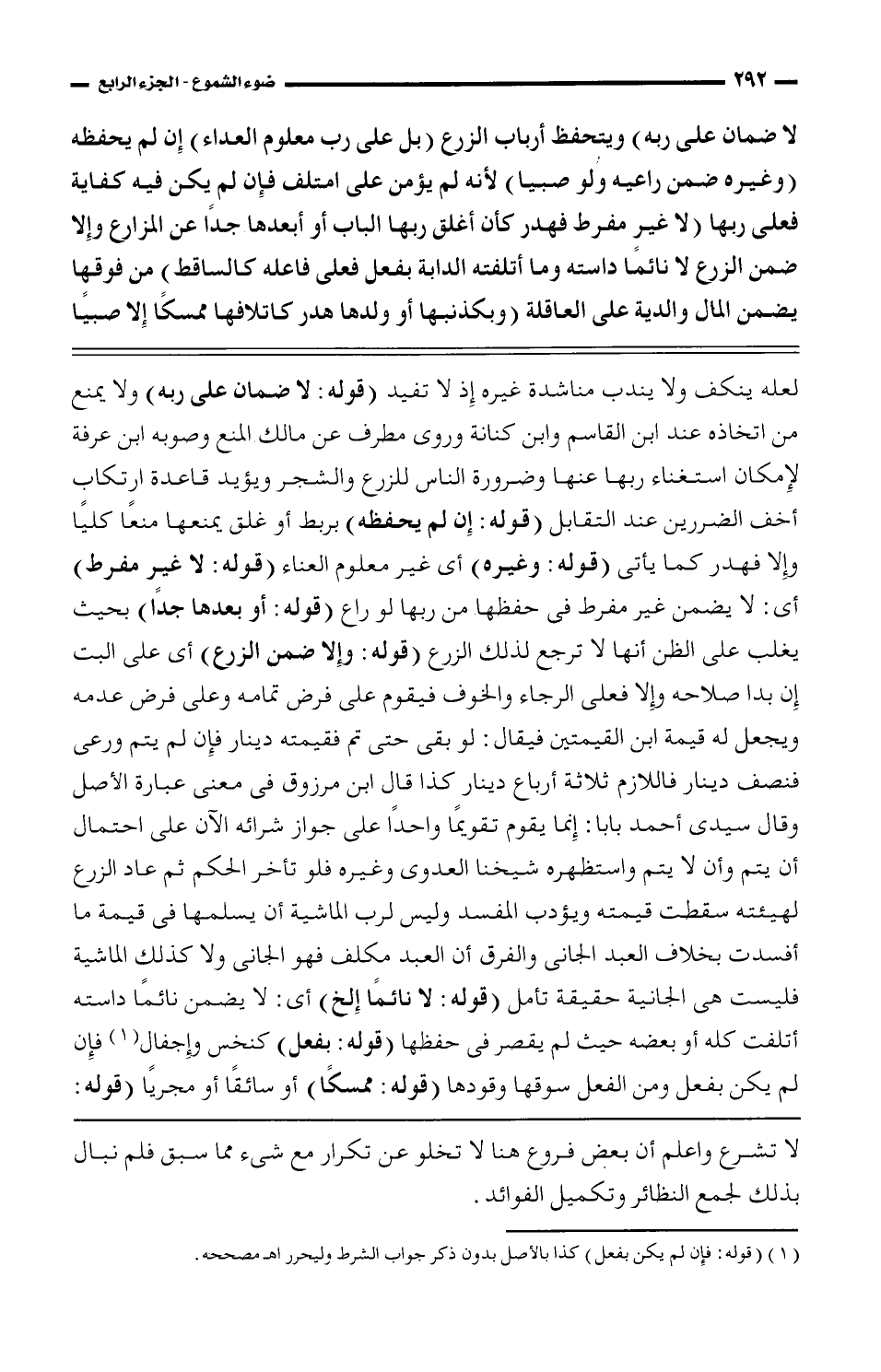 لعله ينكف ولا يندب مناشدة غيره إذ لا تفيد (قوله: لا ضمان على ربه) ولا يمنع من اتخاذه عند ابن القاسم وابن كنانة وروى مطرف عن مالك المنع وصوبه ابن عرفة لإمكان استغناء ربها عنها وضرورة الناس للزرع والشجر ويؤيد قاعدة ارتكاب أخف الضررين عند التقابل (قوله: إن لم يحفظه) بربط أو غلق يمنعها منعاً كلياً وإلا فهدر كما يأتى (قوله: وغيره) أى غير معلوم العناء (قوله: لا غير مفرط) أى: لا يضمن غير مفرط فى حفظها من ربها لو راع (قوله: أو بعدها جداً) بحيث يغلب على الظن أنها لا ترجع لذلك الزرع (قوله: وإلا ضمن الزرع) أى على البت إن بدا صلاحه وإلا فعلى الرجاء والخوف فيقوم على فرض تمامه وعلى فرض عدمه ويجعل له قيمة ابن القيمتين فيقال: لو بقى حتى تم فقيمته دينار فإن لم يتم ورعى فنصف دينار فاللازم ثلاثة أرباع دينار كذا قال ابن مرزوق فى معنى عبارة الأصل وقال سيدى أحمد بابا: إنما يقوم تقويماً واحداً على جواز شرائه الآن على احتمال أن يتم وأن لا يتم واستظهره شيخنا العدوى وغيره فلو تأخر الحكم ثم عاد الزرع لهيئته سقطت قيمته ويؤدب المفسد وليس لرب الماشية أن يسلمها فى قيمة ما أفسدت بخلاف العبد الجانى والفرق أن العبد مكلف فهو الجانى ولا كذلك الماشية فليست هى الجانية حقيقة تأمل (قوله: لا نائماً إلخ) أى: لا يضمن نائماً دراسته أتلفت كله أو بعضه حيث لا يقصر فى حفظها (قوله: بفعل) كنخس وإجفال فإن لم يكن بفعل ومن الفعل سوقها وقودها (قوله: ممسكاً) أو سائقاً أو مجرياً (قوله