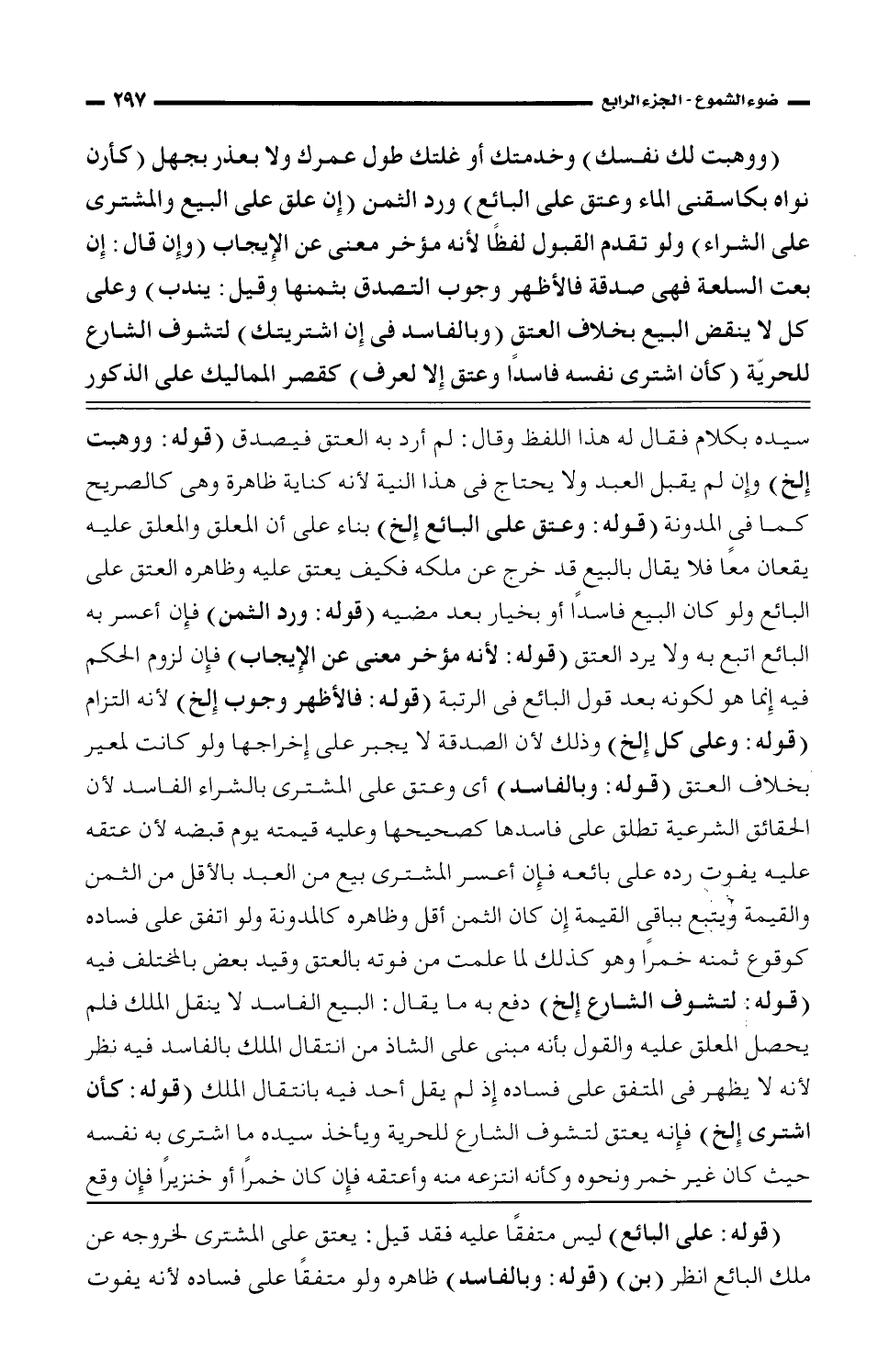 (ووهبت لك نفسك) وخدمتك أو غلتك طول عمرك ولا بعذر بجهل (كأرن نواه بكاسقنى الماء وعتق على البائع) ورد الثمن (إن علق على البيع والمشترى على الشراء) ولو تقدم القبول لفظاً لأنه مؤخر معنى عن الإنجاب (وإن قال: إن بعت السلعة فهى صدفة فالأظهر وجوب التصديق بثمنها وقيل: يندب) وعلى كل لا ينقض البيع بخلاف العتق (وبالفاسد فى إن اشتريتك) لتشوف الشارع للحرية (كأن اشترى نفسه فاسداً وعتق إلا لعرف) كقصر المماليك على الذكور
