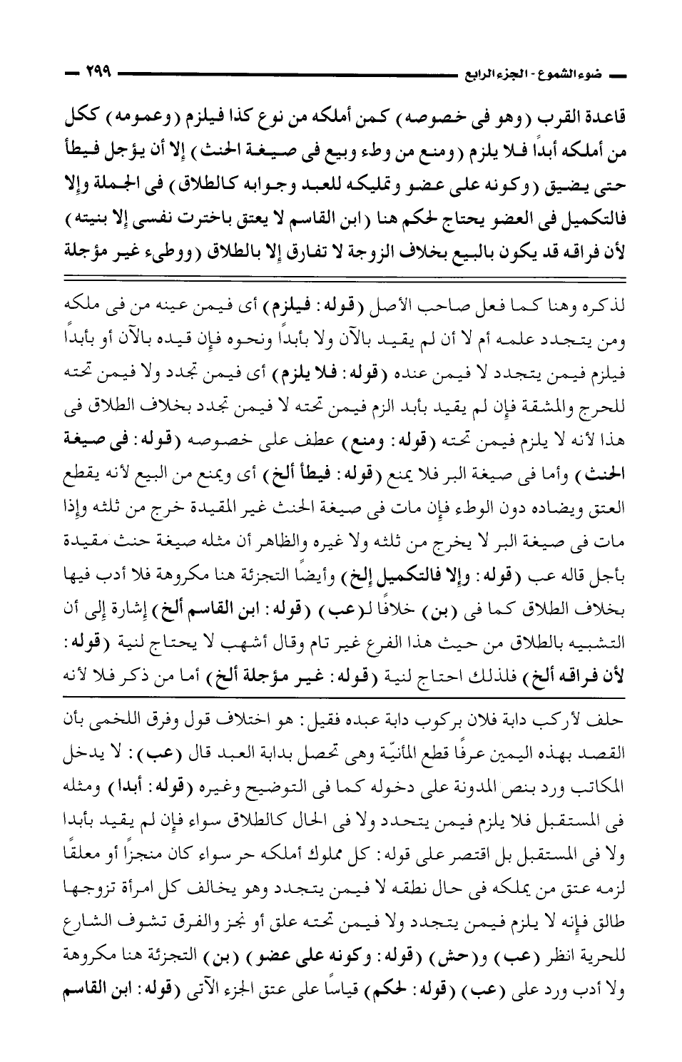 قاعدة القرب (وهو فى خصوصه) كمن أملكه من نوع كذا فيلزم (وعمومه) ككل من أملكه أبداً فلا يلزم (ومنع من وطء فى صيغة الحنث) إلا أن يؤجل فيطأ حتى يضيق (وكونه على عضو وتمليكه للعبد وجوابه كالطلاق) فى الجملة وإلا فالتكميل فى العضو يحتاج لحكم هنا (ابن القاسم لا يعتق باخترت نفسي إلا بنيته لأن فراقه قد يكون بالبيع بخلاف الزوجة لا تفارق إلا بالطلاق (ووطئ غير مؤجلة