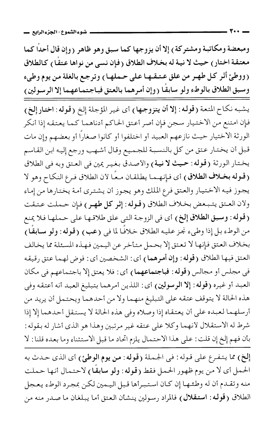 يشبه نكاح المتعة (قوله: إلا أن يتزوجها) أى غير المؤجلة إلخ (قوله: اختار إلخ) فإن امتنع من الاختيار سجن فإن أصر عتق الحاكم أدناهما كما يعتقه إذا أنكر الورثة الاختيار حيث نازعهم العبيد أو اختلفوا أو كانوا صغاراً أو بعضهم وإن مات قبل أن يختار عتق من كل بالنسبة للجميع وقال أشهب ورجع إليه ابن القاسم يختار الورثة (قوله: حيث لا نية) والأصدق بغير يمين فى العتق وبه فى الطلاق (قوله بخلاف الطلاق) أى فإنهما يطلقان معا لأن الطلاق فرع النكاح وهو لا يجوز فيه الاختيار والعقت فرع الملك وهو يجوز أن يشترى أمة يختارها من إماء ولأن العتق يتبعض بخلاف الطلاق (قوله: وسبق الطلاق إلخ) أى فى الزوجة التى علق طلاقها على حملها فلا يمنع (قوله: وسبق الطلاق إلخ) أى فى الزوجة التى علق طلاقها على حملها فلا يمنع من الوطء بل إذا وطئ نجز عليه الطلاق خلافاً لما فى (عب) (قوله: ولو سابقاً) بخلاف العتق فإنها لا تعتق إلا بحمل متأخر عن اليمين فهذه المسئلة مما يخالف العتق فيها الطلاق (قوله: وإن أمرهما) أى: الشخصين أى: فوض لهم عتق رقيقه فى مجلس أو مجالس (قوله: فياجتماعهما) أى: فلا يعتق إلا باجتماعهم فى مكان العبد أو غيره (قوله: إلا الرسولين) أى: اللذين أمرهما بتبليغ العبد أنه أعتقه وفى هذه الحالة لا يتوقف عتقه على التبليغ منهما ولا من أحدهما ويحتمل أن يريد من أرسلهما لعبده على أن يعتقاه إذا وصلاه وفى هذه الحالة لا يستقل أحدهما إلا إذا شرط له الاستقلال لأنهما وكلا على عتقه غير مرتبين وهذا هو الذي أشار له بقوله: بأن فهم إلخ إن قلت: على هذا الاحتمال بلزم اتحاد ما قبل الاستثناء وما بعده قلنا: لا