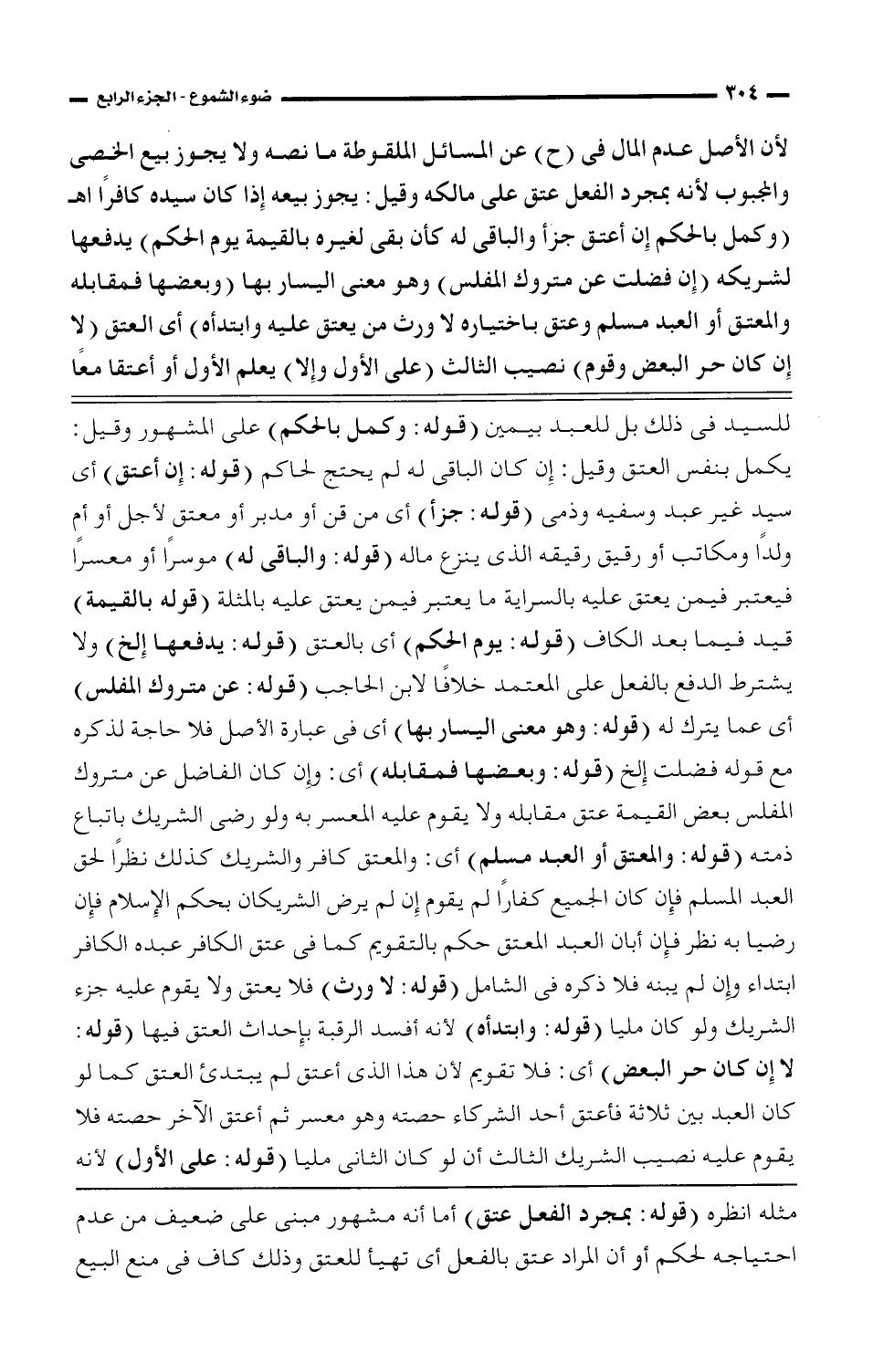 للسيد في ذلك بل للعبد بيمين (قوله: وكمل بالحكم) على المشهور وقيل: يكمل بنفس العتق وقيل: إن كان الباقي له لم يحتج لحاكم (قوله: إن أعتق) أي سيد غير عبد وسيفه وذمي (قوله: جزأ) أي من قن أو مدبر أو معتق لأجل أو أم ولداً ومكاتب أو رقيق رقيقه الذي ينزع ماله (قوله: والباقي له) موسراً أو معسراً فيعتبر فيمن عليه بالسراية ما يعتبر فيمن يعتق عليه بالمثلة (قوله بالقيمة) قيد فيما بعد الكاف (قوله: يوم الحكم) أي بالعتق (قوله: يدفعها إلخ) ولا يشترط الدفع بالفعل على المعتمد خلافاً لابن الحاجب (قوله: عن متروك المفلس) أي عما يترك له (قوله: وهو معنى اليسار بها) أي في عبارة الأصل فلا حاجة لذكره مع قوله فضلت إلخ (قوله: وبعضها فمقابله) أي: وإن كان الفاضل عن متروك المفلس بعض القيمة عتق مقابله ولا يقوم عليه المعسر به ولو رضي الشريك بإتباع ذمته (قوله: والمعتق أو العبد مسلم) أي: والمعتق كافر والشريك كذلك نظراً لحق العبد المسلم فإن كان الجميع كفاراً لم يقوم إن لم يرض الشريكان بحكم الإسلام فإن رضيا به نظر فإن أبان العبد المعتق حكم بالتقويم كما في عتق الكافر عبده الكافر ابتداء وإن لم يبنه فلا ذكره في الشامل (قوله: لا ورث) فلا يعتق ولا يقوم عليه جزء الشريك ولو كان مليا (قوله: وابتدأه) لأنه أفسد الرقبة بإحداث العتق فيها (قوله: لا إن كان حر البعض) أي: فلا تقويم لأن هذا الذي أعتق لم يبتدئ العتق كما لو كان العبد بين ثلاثة فأعتق أحد الشركاء حصته وهو معسر ثم أعتق الآخر حصته فلا يقوم عليه نصيب الشريك الثالث أن لو كان الثاني مليا (قوله: على الأول) لأنه