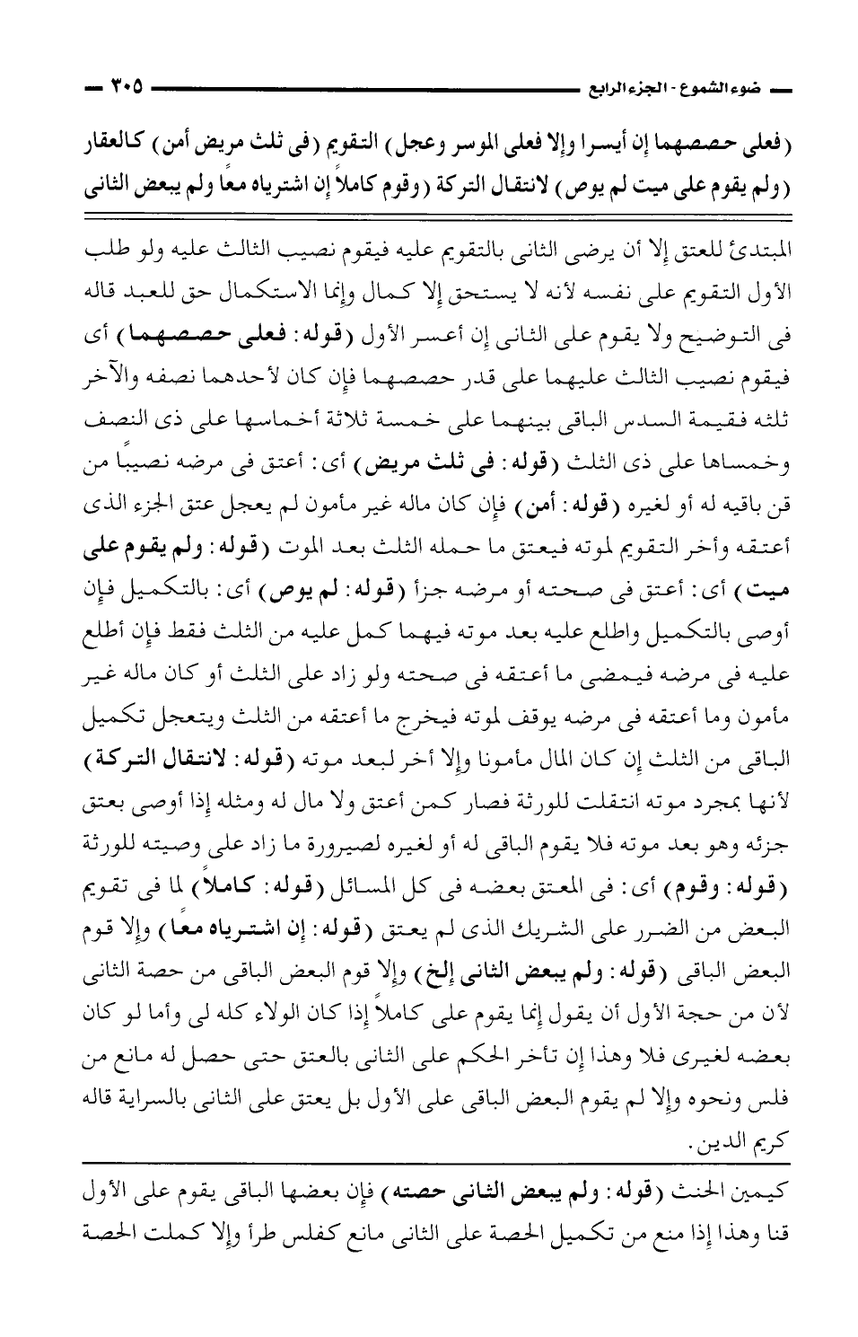 المبتدئ للعتق إلا أن يرضى الثاني بالتقويم عليه فيقوم نصيب الثالث عليه ولو طلب الأول التقويم على نفسه لأنه لا يستحق إلا كمال وإنما الاستكمال حق للعبد قاله في التوضيح ولا يقوم على الثاني إن أعسر الأول (قوله: فعلى حصصهما) أي فيقوم نصيب الثالث عليهما على قدر حصصهما فإن كان لأحدهما نصفه والآخر ثلثه فقيمة السدس الباقي بينهما على خمسة ثلاثة أخماسها على ذي النصف وخمساها على ذي الثلث (قوله: في ثلث مريض) أي: أعتق في مرضه نصيباً من قن باقية له أو لغيره (قوله: أمن) فإن كان ماله غير مأمون لم يعجل عتق الجزء الذي أعتقه وأخر التقويم لموته فيعتق ما حمله الثلث بعد الموت (قوله: ولم يقوم على ميت) أي: أعتق في صحته أو مرضه جزأ (قوله: لم يوص) أي: بالتكميل فإن أوصى بالتكميل واطلع عليه بعد موته فيهما كمل عليه من الثلث فقط فإن أطلع عليه في مرضه فيمضي ما أعتقه في صحته ولو زاد على الثلث أو كان ماله غير مأمون وما أعتقه في مرضه يوقف لموته فيخرج ما أعتقه من الثلث ويتعجل تكميل الباقي من الثلث إن كان المال مأمونا وإلا أخر لبعد موته (قوله: لانتقال التركة) لأنها بمجرد موته انتقلت للورثة فصار كمن أعتق ولا مال له ومثله إذا أوصى بعتق جزئه وهو بعد موته فلا يقوم الباقي له أو لغيره لصيرورة ما زاد على وصيته للورثة (قوله: وقوم) أي: في المعتق بعضه في كل المسائل (قوله: كاملاً) لما في تقويم البعض من الضرر على الشريك الذي لم يعتق (قوله: إن اشترياه معاً) وإلا قوم البعض الباقي (قوله: ولم يبعض الثاني إلخ) وإلا قوم البعض الباقي من حصة الثاني لأن من حجة الأول أن يقول إنما يقوم على كاملاً إذا كان الولاء كله لي وأما لو كان بعضه لغيري فلا وهذا إن تأخر الحكم على الثاني بالعتق حتى حصل له مانع من فلس ونحوه وإلا لم يقوم البعض الباقي على الأول بل يعتق على الثاني بالسراية قاله كريم الدين.