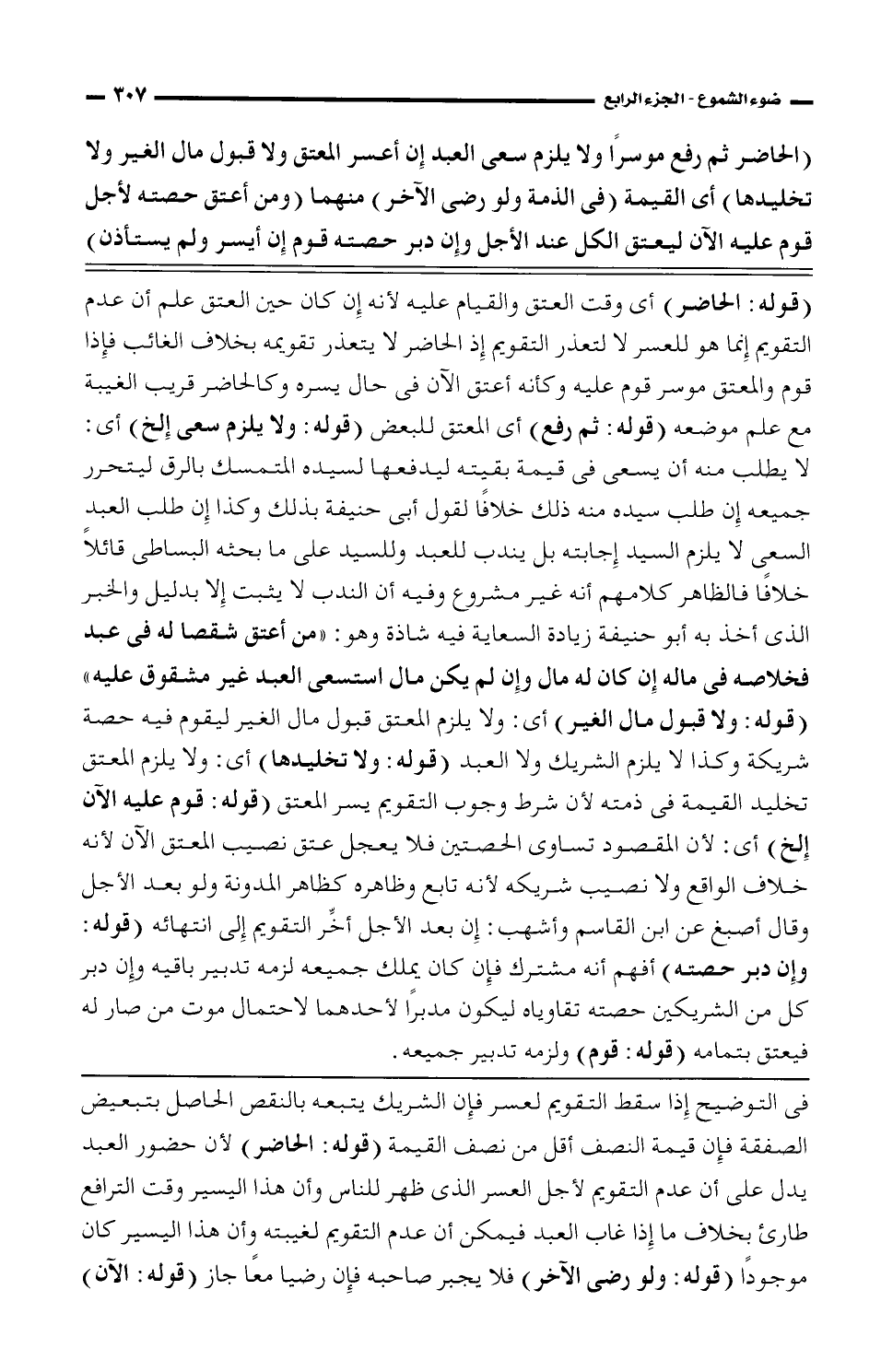 (قوله: الحاضر) أي وقت العتق والقيام عليه لأنه إن كان حين العتق علم أن عدم التقويم إنما هو للعسر لا لتعذر التقويم إذ الحاضر لا يتعذر تقويمه بخلاف الغائب فإذا قوم والمعتق موسر قوم عليه وكأنه أعتق الآن في حال يسره وكالحاضر قريب الغيبة مع علم موضعه (قوله: ثم رفع) أي المعتق للبعض (قوله: ولا يلزم سعي إلخ) أي: لا يطلب منه أن يسعى في قيمة بقيته ليدفعها لسيده المتمسك بالرق ليتحرر جميعه إن طلب سيده منه ذلك خلافاً لقول أبي حنيفة بذلك وكذا إن طلب العبد السعي لا يلزم السيد إجابته بل يندب للعبد وللسيد على ما بحثه البساطي قائلاً خلافاً فالظاهر كلامهم أنه غير مشروع وفيه أن الندب لا يثبت إلا بالدليل والخبر الذي أخذ به أبو حنيفة زيادة السعاية فيه شاذة وهو: «من أعتق شقصا له في عبد فخلاصه في ماله إن كان له مال وإن لم يكن مال استسعى العبد غير مشقوق عليه» (قوله: ولا قبول مال الغير) أي: ولا يلزم المعتق قبول مال الغير ليقوم فيه حصة شريكة وكذا لا يلزم الشريك ولا العبد (قوله: ولا تخليدها) أي: ولا يلزم المعتق تخليد القيمة في ذمته لأن شرط وجوب التقويم يسر المعتق (قوله: قوم عليه الآن إلخ) أي: لأن المقصود تساوي الحصتين فلا يعجل عتق نصيب المعتق الآن لأنه خلاف الواقع ولا نصيب شريكه لأنه تابع وظاهره كظاهر المدونة ولو بعد الأجل وقال أصبغ عن ابن القاسم وأشهب: إن بعد الأجل أخر التقويم إلى انتهائه (قوله: وإن دبر حصته) أفهم أنه مشترك فإن كان يملك جميعه لزمه تدبير باقية وإن دبر كل من الشريكين حصته تقاوياه ليكون مدبراً لأحدهما لاحتمال موت من صار له فيعتق بتمامه (قوله: قوم) ولزمه تدبير جميعه.