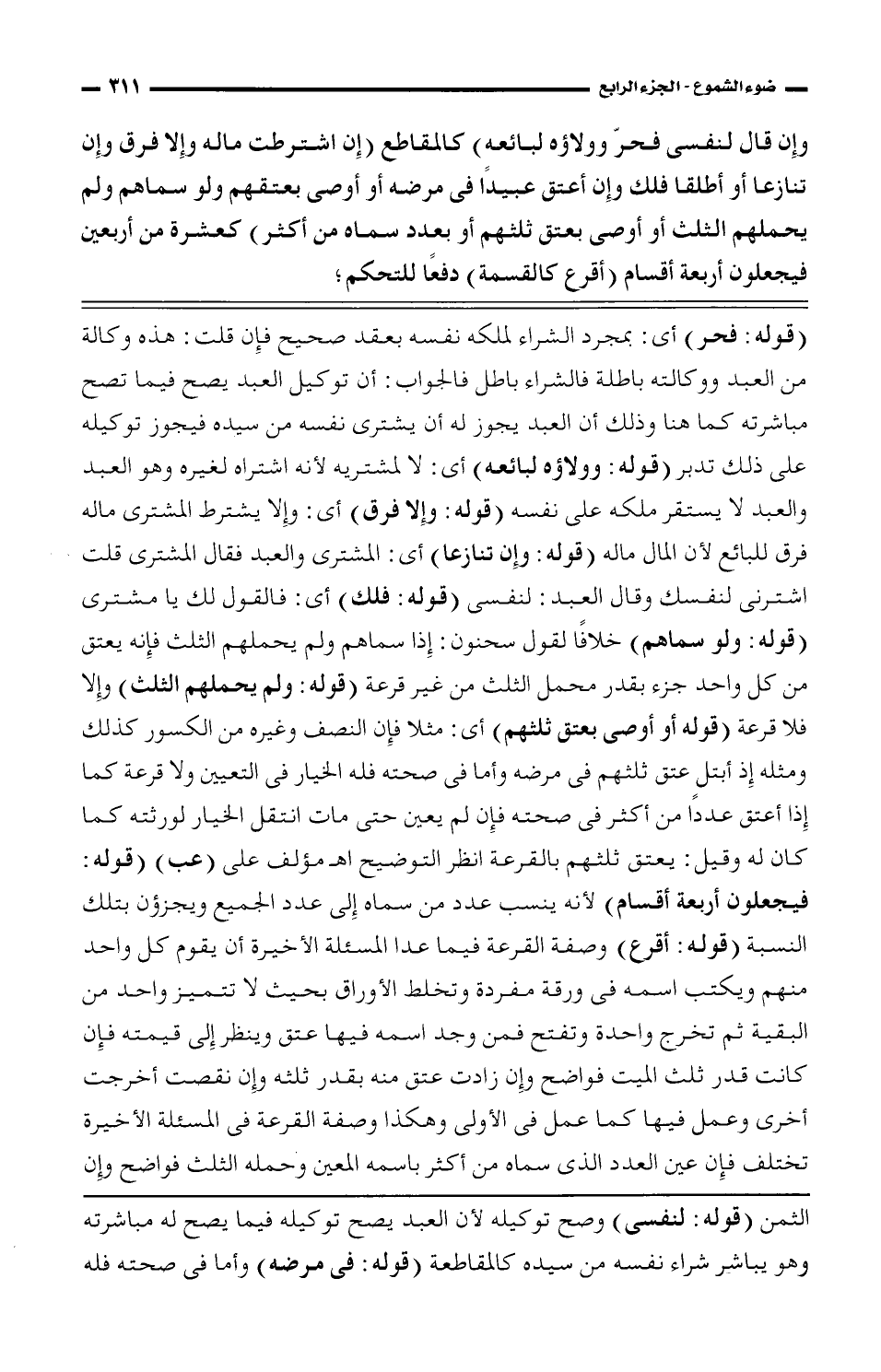 (قوله: فحر) أي: بمجرد الشراء لملكه نفسه بعقد صحيح فإن قلت: هذه وكالة من العبد ووكالته باطلة فالشراء باطل فالجواب: أن توكيل العبد يصح فيما تصح مباشرته كما هنا وذلك أن العبد يجوز له أن يشتري نفسه من سيده فيجوز توكيله على ذلك تدبر (قوله: وولاؤه لبائعه) أي: لا لمشتريه لأنه اشتراه لغيره وهو العبد والعبد لا يستقر ملكه على نفسه (قوله: وإلا فرق) أي: وإلا يشترط المشترى ماله فرق للبائع لأن المال ماله (قوله: وإن تنازعا) أي: المشترى والعبد فقال المشترى قلت اشترني لنفسك وقال العبد: لنفسي (قوله: فلك) أي: فالقول لك يا مشترى (قوله: ولو سماهم) خلافاً لقول سحنون: إذا سماهم ولم يحملهم الثلث فإنه يعتق من كل واحد جزء بقدر محمل الثلث من غير قرعة (قوله: ولم يحملهم الثلث) وإلا فلا قرعة (قوله أو أوصى بعتق ثلثهم) أي: مثلا فإن النصف وغيره من الكسور كذلك ومثله إذ أبتل عتق ثلثهم في مرضه وأما في صحته فله الخيار في التعيين ولا قرعة كما إذا أعتق عدداً من أكثر في صحته فإن لم يعين حتى مات انتقل الخيار لورثته كما كان له وقيل: يعتق ثلثهم بالقرعة انظر التوضيح اهـ مؤلف على (عب) (قوله: فيجعلون أربعة أقسام) لأنه ينسب عدد من سماه إلى عدد الجميع ويجزؤن بتلك النسبة (قوله: أقرع) وصفة القرعة فيما عدا المسئلة الأخيرة أن يقوم كل واحد منهم ويكتب اسمه في ورقة مفردة وتخلط الأوراق بحيث لا تتميز واحد من البقية ثم تخرج واحدة وتفتح فمن وجد اسمه فيها عتق وينظر إلى قيمته فإن كانت قدر ثلث الميت فواضح وإن زادت عتق منه بقدر ثلثه وإن نقصت أخرجت أخرى وعمل فيها كما عمل في الأولى وهكذا وصفة القرعة في المسئلة الأخيرة تختلف فإن عين العدد الذي سماه من أكثر باسمه المعين وحمله الثلث فواضح وإن