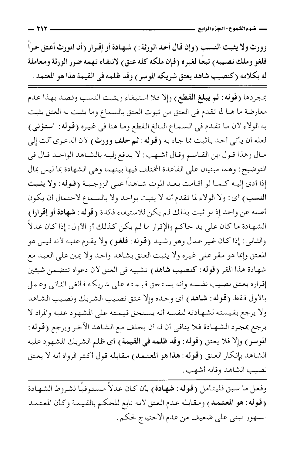 بمجردها (قوله: لم يبلغ القطع) وإلا فلا استيفاء ويثبت النسب وقصد بهذا عدم معارضة ما هنا لما تقدم في العتق من ثبوت العتق بالسماع وما يثبت به العتق يثبت به الولاء لأن ما تقدم في السماع البالغ القطع وما هنا في غيره (قوله: استؤني) لعله أن يأتي أحد بأثبت مما جاء به (قوله: ثم حلف وورث) لأن الدعوى آلت إلى مال وهذا قول ابن القاسم وقال أشهب: لا يدفع إليه بالشاهد الواحد قال في التوضيح: وهما مبنيان على القاعدة المختلف فيها بينهما وهي الشهادة بما ليس بمال إذا أدى إليه كما لو أقامت بعد الموت شاهداً على الزوجية (قوله: ولا يثبت النسب) أي: ولا الولاء لما تقدم أنه لا يثبت بواحد ولا بالسماع لاحتمال أن يكون أصله عن واحد إذ لو ثبت بذلك لم يكن للاستيفاء فائدة (قوله: شهادة أو إقرارا) الشهادة ما كان على يد حاكم والإقرار ما لم يكن كذلك أو الأول: إذا كان عدلاً والثاني: إذا كان غير عدل وهو رشيد (قوله: فلغو) ولا يقوم عليه لأنه ليس هو المعتق وإنما هو مقر على غيره ولا يثبت العتق بشاهد واحد ولا يمين على العبد مع شهادة هذا المقر (قوله: كنصيب شاهد) تشبيه في العتق لأن دعواه تتضمن شيئين إقراره بعتق نصيب نفسه وأنه يستحق قيمته على شريكه فألغى الثاني وعمل بالأول فقط (قوله: شاهد) أي وحده وإلا عتق نصيب الشريك ونصيب الشاهد ولا يرجع بقيمته لشهادته لنفسه أنه يستحق قيمته على المشهود عليه والمراد لا يرجع بمجرد الشهادة فلا ينافي أن له أن يحلف مع الشاهد الآخر ويرجع (قوله: الموسر) وإلا فلا يعتق (قوله: وقد ظلمه في القيمة) أي ظلم الشريك المشهود عليه الشاهد بإنكار العتق (قوله: هذا هو المعتمد) مقابله قول أكثر الرواة أنه لا يعتق نصيب الشاهد وقاله أشهب.