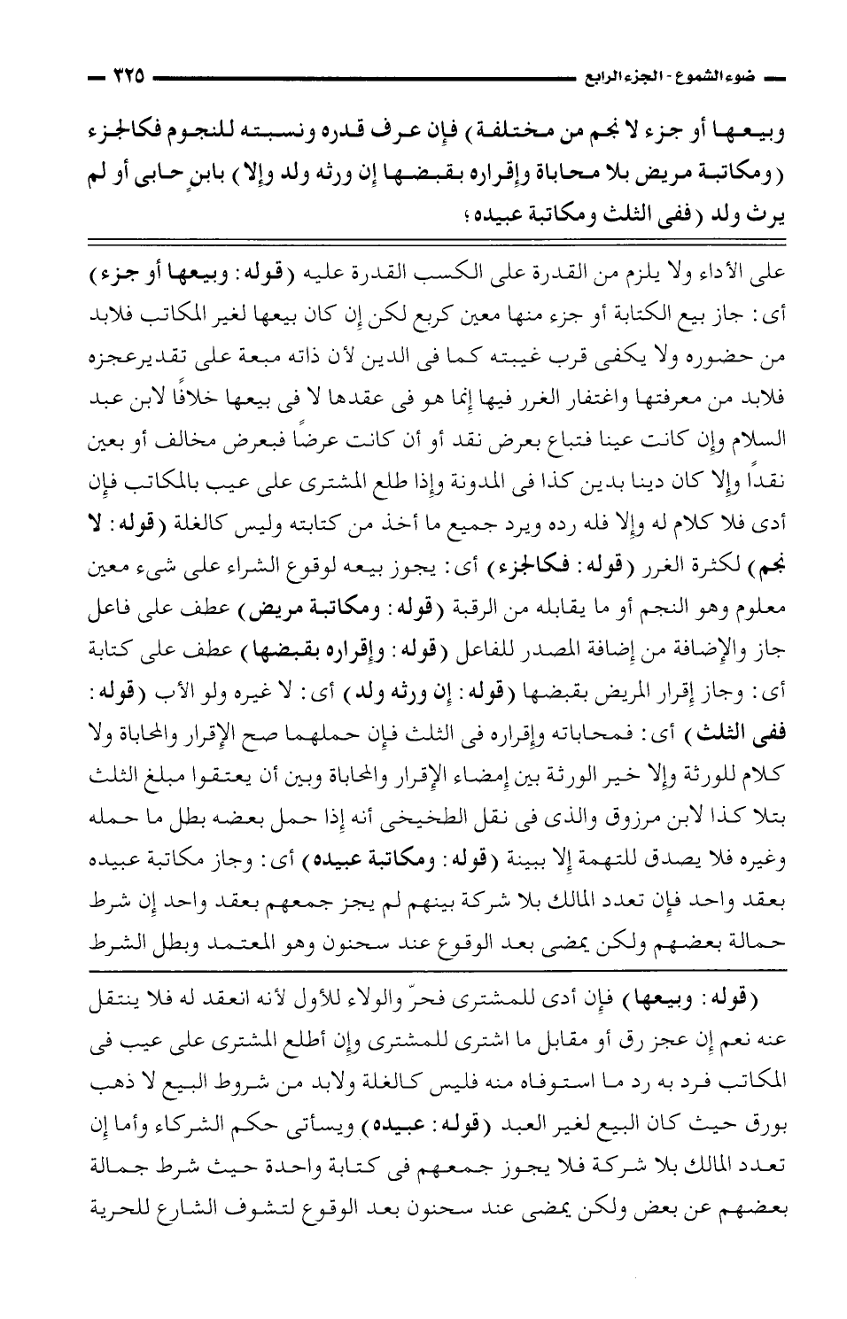 (قوله: وبيعها) فإن أدى للمشترى فحرّ والولاء للأول لأنه انعقد له فلا ينتقل عنه نعم إن عجز رق أو مقابل ما اشترى للمشترى وإن أطلع المشترى على عيب في المكاتب فرد به رد ما استوفاه منه فليس كالغلة ولابد من شروط البيع لا ذهب بورق حيث كان البيع لغير العبد (قوله: عبيده) ويسأتى حكم الشركاء وأما إن تعدد المالك بلا شركة فلا يجوز جمعهم في كتابة واحدة حيث شرط جمالة بعضهم عن بعض ولكن يمضى عند سحنون بعد الوقوع لتشوف الشارع للحرية