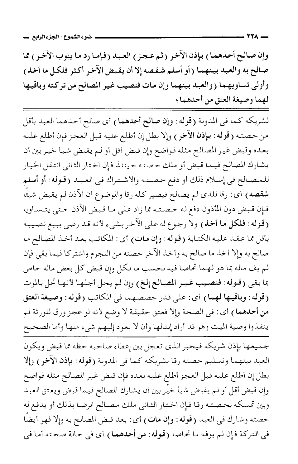 لشريكه كما في المدونة (قوله: وإن صالح أحدهما) أي صالح أحدهما العبد بأقل من حصته (قوله: بإذن الآخر) وإلا بطل إن أطلع عليه قبل العجز فإن أطلع عليه بعده وقبض غير المصالح مثله فواضح وإن قبض أقل أو لم يقبض شيأ خير بين أن يشارك المصالح فيما قبض أو ملك حصته حينئذ فإن اختار الثاني انتقل الخيار للمصالح في إسلام ذلك أو دفع حصته والاشتراك في العبد (قوله: أو أسلم شقصه) أي: رقا للذي لم يصالح فيصير كله رقا والموضوع أن الآذن لم يقبض شيئًا فإن قبض دون المأذون دفع له حصته مما زاد على ما قبض الآذن حتى يتساويا (قوله: فلكل ما أخذ) ولا رجوع له على الآخر بشيء لأنه قد رضي ببيع نصيبه بأقل مما عقد عليه الكتابة (قوله: وإن مات) أي: المكاتب بعد أخذ المصالح ما صالح به وإلا أخذ ما صالح به وأخذ الآخر حصته من النجوم واشتركا فيما بقى فإن لم يف ماله بما هو لهما تحاصا فيه بحسب ما لكل وإن قبض كل بعض ماله حاص بما بقى (قوله: فنصيب غير المصالح الخ) وإن لم يحل أجلها لأنها تحل بالموت (قوله: وباقيها لهما) أي: على قدر حصصهما في المكاتب (قوله: وصيغة العتق من أحدهما) أي: في الصحة إلا فعتق حقيقة لا وضع لأنه لو عجز ورق للورثة لم ينفذوا وصية الميت وهو قد أرد إبتالها وأن لا يعود إليهم شيء منها وأما الصحيح