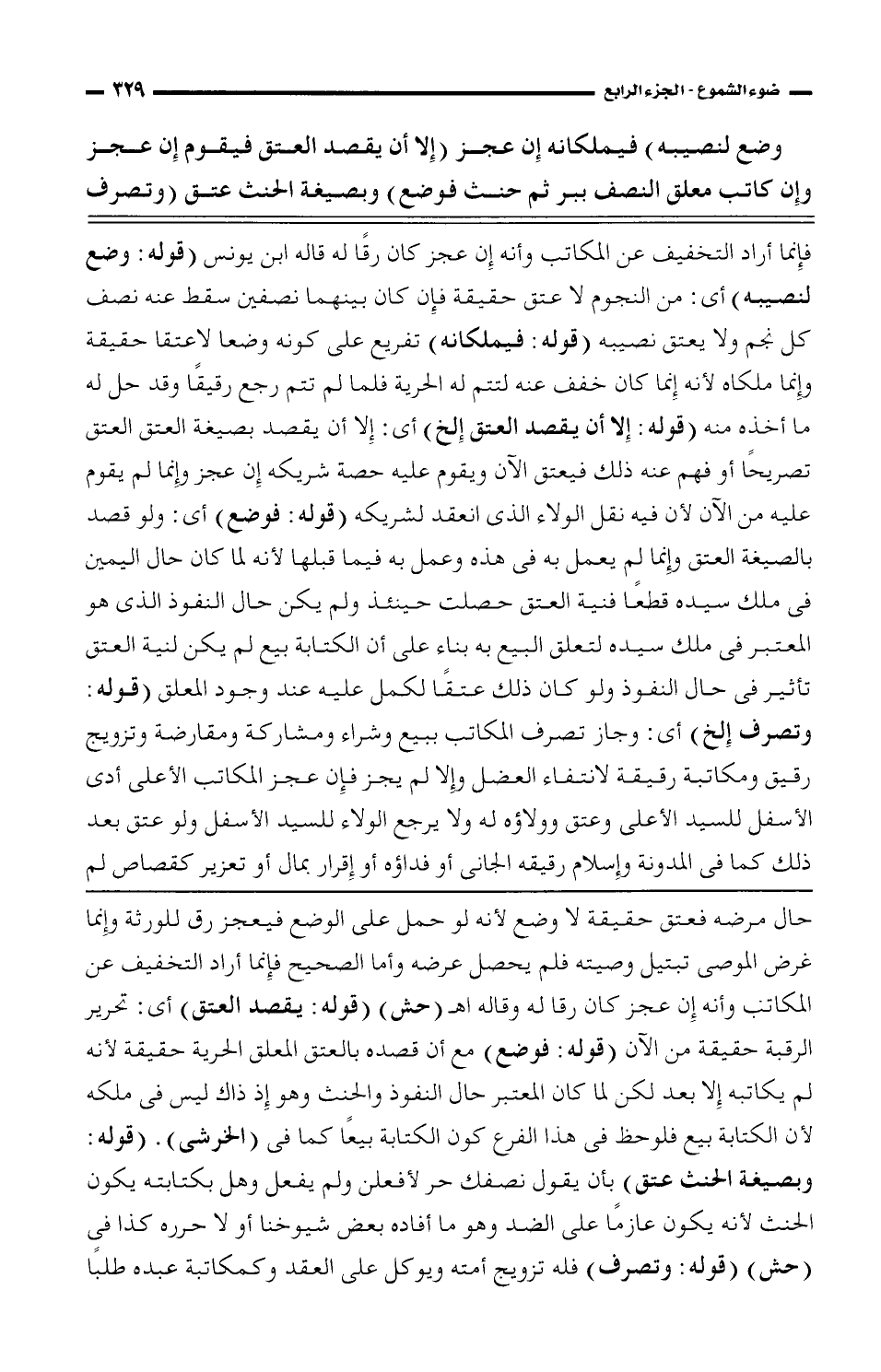 فإنما أراد التخفيف عن المكاتب وأنه إن عجز كان رقًا له قاله ابن يونس (قوله: وضع لنصيبه) أي: من النجوم لا عتق حقيقة فإن كان بينهما نصفين سقط عنه نصف كل نجم ولا يعتق نصيبه (قوله: فيملكانه) تفريع على كونه وضعًا لا عتقًا حقيقة وإنما ملكاه لأنه إنما كان خفف عنه لتتم له الحرية فلما لم تتم رجع رقيقًا وقد حل له ما أخذه منه (قوله: إلا أن يقصد العتق الخ) أي: إلا أن يقصد بصيغة العتق العتق تصريحًا أو فهم عنه ذلك فيعتق الآن ويقوم عليه حصة شريكه إن عجز وإنما لم يقوم عليه من الآن لأن فيه نقل الولاء الذي انعقد لشريكه (قوله: فوضع) أي: ولو قصد بالصيغة العتق وإنما لم يعمل به في هذه وعمل به فيما قبلها أنه لما كان حال اليمين في ملك سيده قطعًا فنبة العتق حصلت حينئذ ولم يكن حال النفوذ الذي هو المعتبر في ملك سيده لتعلق البيع به بناء على أن الكتابة بيع لم يكن لنية العتق تأثير في حال النفوذ ولو كان ذلك عتقًا لكمل عليه عند وجود المعلق (قوله: وتصرف الخ) أي: وجاز تصرف المكاتب ببيع وشراء ومشاركة ومقارضة وتزويج رقيق ومكاتبة رقيقة لانتفاء العضل وإلا لم يجز فإن عجز المكاتب الأعلى أدى الأسفل للسيد الأعلى وعتق وولاؤه له ولا يرجع الولاء للسيد الأسفل ولو عتق بعد ذلك كما في المدونة وإسلام رقيقة الجاني أو فداؤه أو إقرار بمال أو تعزير كقصاص لم