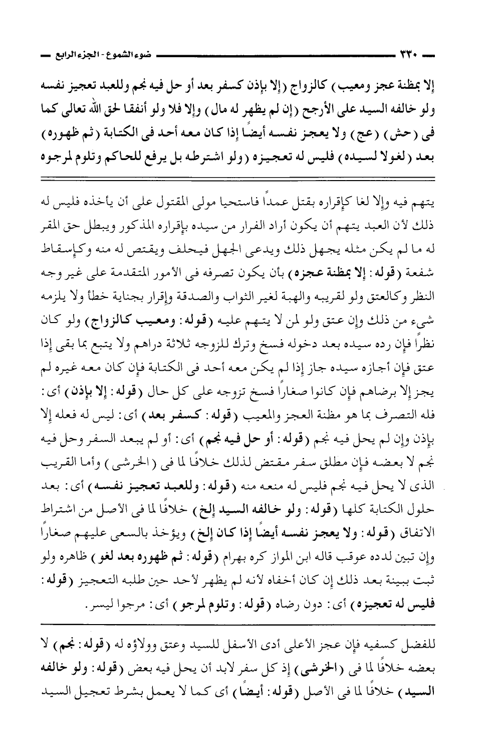 إلا بمظنة عجز ومعيب) كالزواج (إلا بإذن كسفر بعد أو حل فيه نجم وللعبد تعجيز نفسه ولو خالفه السيد على الأرجح (إن لم يظهر له مال) وإلا فلا ولو أنفقا لحق الله تعالى كما في (حش) (عج) ولا يعجز نفسه أيضًا إذا كان معه أحد في الكتابة (ثم ظهوره) بعد (لغولا لسيده) فليس له تعجيزه (ولو اشترطه بل يرفع للحاكم وتلوم لمرجوه