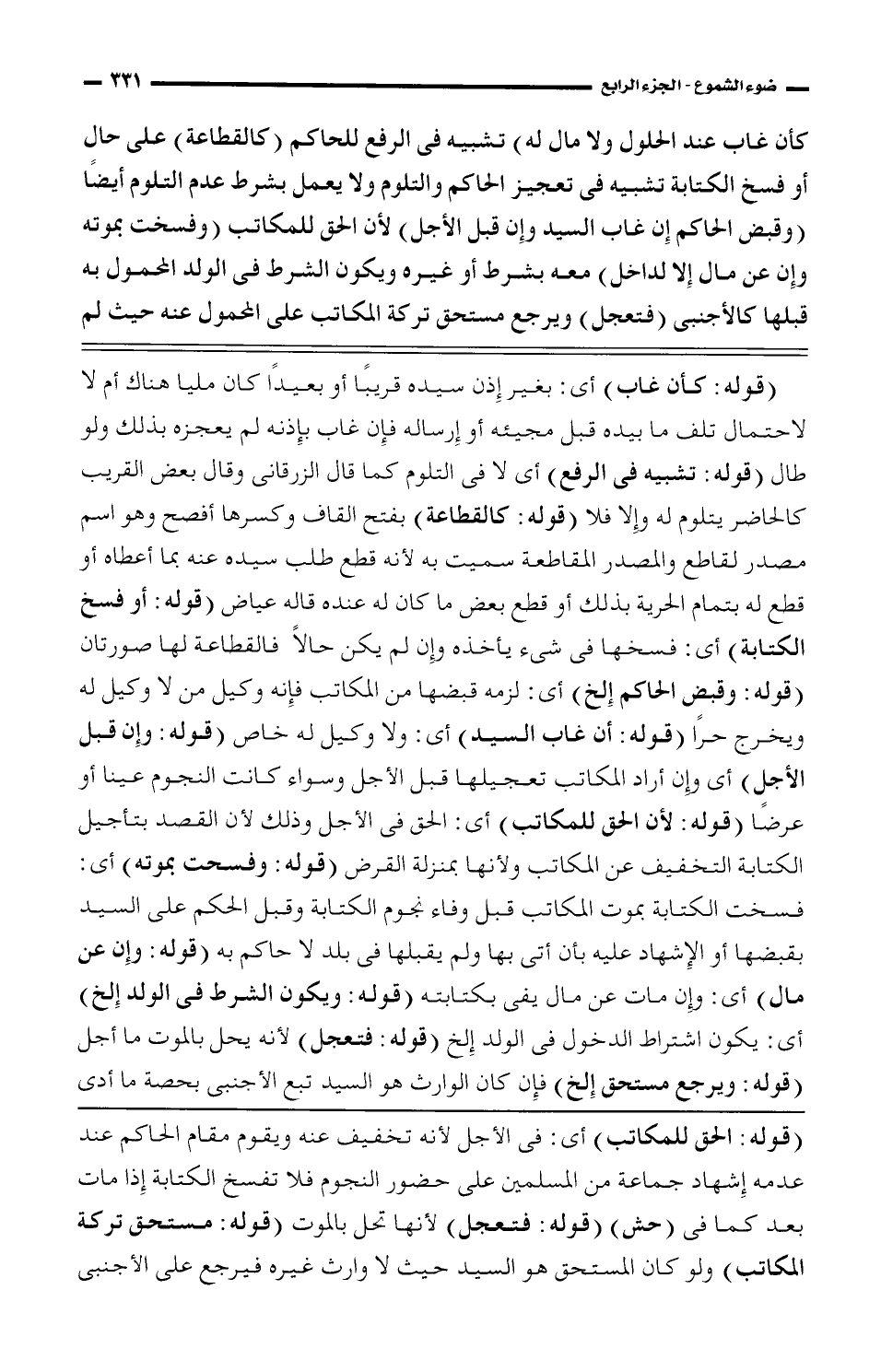 (قوله: كأن غاب) أي: بغير إذن سيده قريبًا أو بعيدًا كان مليًا هناك أن لا لاحتمال تلف ما بيده قبل مجيئه أو إرساله فإن غاب بإذنه لم يعجزه بذلك ولو طال (قوله: تشبيه في الرفع) أي لا في التلوم كما قال الزرقاني وقال بعض القريب كالحاضر يتلوم له وإلا فلا (قوله: كالقطاعة) بفتح القاف وكسرها أفصح وهو اسم مصدر لقاطع والمصدر المقاطعة سميت به لأنه قطع طلب سيده عنه بما أعطاه أو قطع له بتمام الحرية بذلك أو قطع بعض ما كان له عنده قاله عياض (قوله: أو فسخ الكتابة) أي: فسخها في شيء يأخذه وإن لم يكن حالاً فالقطاعة لها صورتان (قوله: وقبض الحاكم الخ) أي: لزمه قبضها من المكاتب فإنه وكيل من لا وكيل له ويخرج حرًا (قوله: أن غاب السيد) أي: ولا وكيل له خاص (قوله: وإن قبل الأجل) أي وإن أراد المكاتب تعجيلها قبل الأجل وسواء كانت النجوم عينًا أو عرضًا (قوله: لأن الحق للمكاتب) أي: الحق في الأجل وذلك لأن القصد بتأجيل الكتابة التخفيف عن المكاتب ولأنها بمنزلة القرض (قوله: وفسحت بموته) أي: فسخت الكتابة بموت المكاتب قبل وفاء نجوم الكتابة وقبل الحكم على السيد بقبضها أو الإشهاد عليه بأن أتى بها ولم يقبلها في بلد لا حاكم به (قوله: وإن عن مال) أي: وإن مات عن مال يفي بكتابته (قوله: ويكون الشرط في الولد الخ) أي: يكون اشتراط الدخول في الولد الخ (قوله: فتعجل) لأنه يحل بالموت ما أجل (قوله: ويرجع مستحق الخ) فإن كان الوارث هو السيد تبع الأجنبي بحصة ما أدى