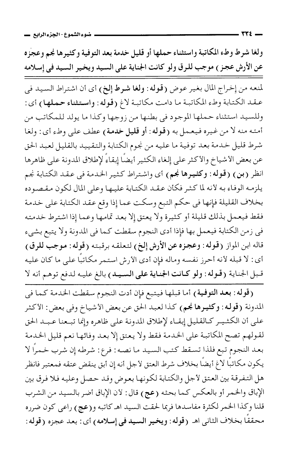 (قوله: بعد التوفية) أما قبلها فيتبع فإن أدت النجوم سقطت الخدمة كما في المدونة (قوله: وكثيرها نجم) كذا لعبد الحق عن بعض الأشياخ وفي بعض: الأكثر على أن الكثير كالقليل إبقاء لإطلاق المدونة على ظاهره وإنما تبعنا عبد الحق لقولهم تصح المكاتبة على الخدمة فقط ولا يعتق إلا بعد وفائها نعم قليل الخدمة بعد النجوم تبع فلذا تسقط كتب السيد ما نصه: فرع: شرطه إن شرب خمرًا لا يكون مكاتبًا لاغ أيضًا بخلاف شرط العتق لأجل أنه إن أبق ينقض عتقه فمعتبر فانظر هل التفرقة بين العتق لأجل والكتابة لكونها بعوض وقد حصل وعليه فلا فرق بين الإباق والخمر أو بالعكس كما بحثه (عج) قال: لأن الإباق أضر بالسيد من الشرب قلنا وكذا الخمر لكثرة مفاسدها فربما لحقت السيد اهـ كاتبه و (عج) راعى كون ضرره محققًا بخلاف الثاني اهـ (قوله: ويخير السيد في إسلامه) أي: بعد عجزه (قوله: