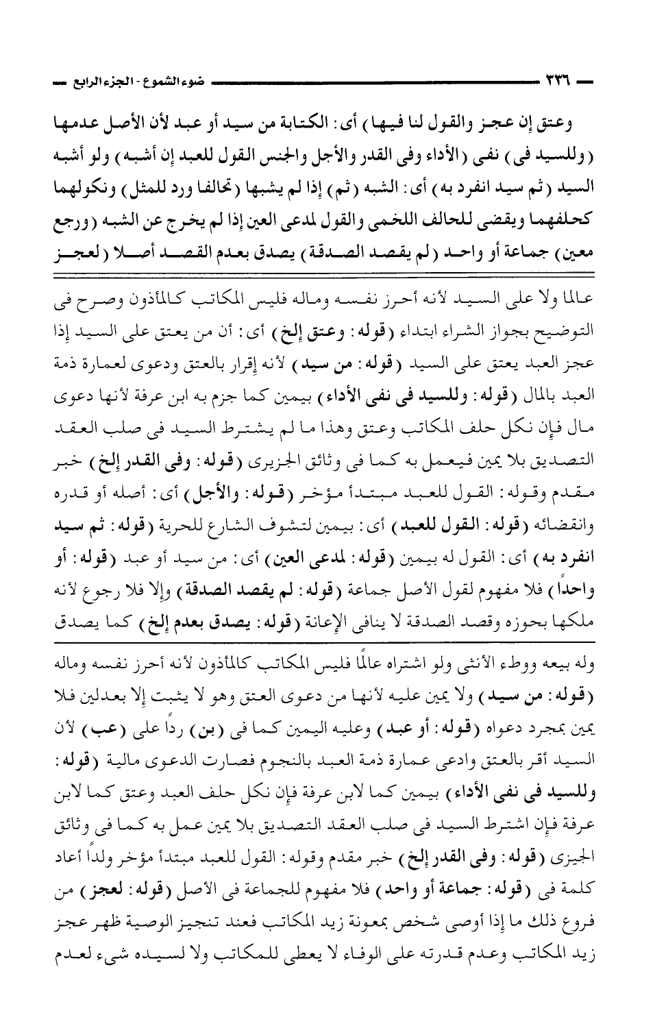 عالمًا ولا على السيد لأنه أحرز نفسه وماله فليس المكاتب كالمأذون وصرح في التوضيح بجواز الشراء ابتداء (قوله: وعتق الخ) أي: أن من يعتق على السيد إذا عجز العبد يعتق على السيد (قوله: من سيد) لأنه إقرار بالعتق ودعوى لعمارة ذمة العبد بالمال (قوله: وللسيد في نفى الأداء) بيمين كما جزم به ابن عرفة لأنها دعوى مال فإن نكل حلف المكاتب وعتق وهذا ما لم يشترط السيد في صلب العقد التصديق بلا يمين فيعمل به كما في وثائق الجزيري (قوله: وفي القدر الخ) خبر مقدم وقوله: القول للعبد مبتدأ مؤخر (قوله: والأجل) أي: أصله أو قدره وانقضائه (قوله: القول للعبد) أي: بيمين لتشوف الشارع للحرية (قوله: ثم سيد انفرد به) أي: القول له بيمين (قوله: لمدعى العين) أي: من سيد أو عبد (قوله: أو واحدًا) فلا مفهوم لقول الأصل جماعة (قوله: لم يقصد الصدقة) وإلا فلا رجوع لأنه ملكها بحوزه وقصد الصدقة لا ينافى الإعانة (قوله: يصدق بعدم الخ) كما يصدق