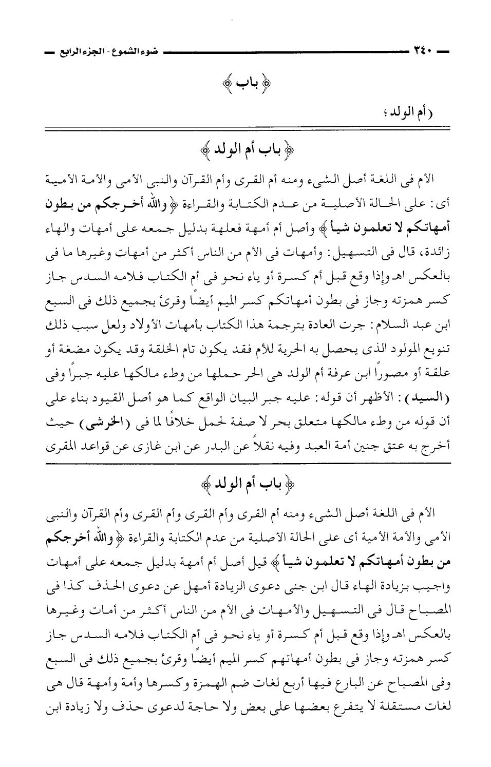 الأم في اللغة أصل الشيء ومنه أم القرى وأم القرآن والنبي الأمي والأمة الأمية أي: على الحالة الأصلية من عدم الكتابة والقراءة {والله أخرجكم من بطون أمهاتكم لا تعلمون شيئًا} وأصل أم أمهة فعلهة بدليل جمعه على أمهات والهاء زائدة، قال في التسهيل: وأمهات في الأم من الناس أكثر من أمهات وغيرها ما في بالعكس اهـ وإذا وقع قبل أم كسرة أو ياء نحو في أم الكتاب فلأمه السدس جاز كسر همزته وجاز في بطون أمهاتكم كسر الميم أيضًا وقرئ بجميع ذلك في السبع ابن عبد السلام: جرت العادة بترجمة هذا الكتاب بأمهات الأولاد ولعل سبب ذلك تنويع المولود الذي يحصل به الحرية للأم فقد يكون تام الخلقة وقد يكون مضغة أو علقة أو مصورًا ابن عرفة أم الولد هي الحر حملها من وطء مالكها عليه جبرًا وفي (السيد): الأظهر أن قوله: عليه جبر البيان الواقع كما هو أصل القيود بناء على أن قوله من وطء مالكها متعلق بحر لا صفة لحمل خلافًا لما في (الخرشي) حيث أخرج به عتق جنين أمة العبد وفيه نقلاً عن البدر عن ابن غازي عن قواعد المقري
