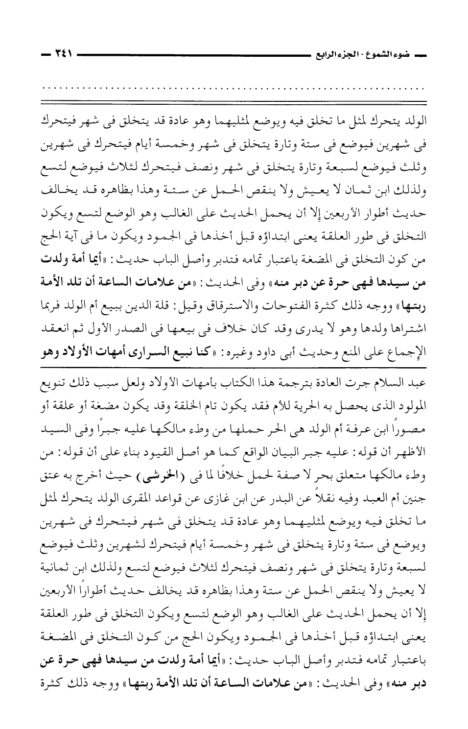 الولد يتحرك لمثل ما تخلق فيه ويوضع لمثليهما وهو عادة قد يتخلق في شهر فيتحرك في شهرين فيوضع في ستة وتارة يتخلق في شهر وخمسة أيام فيتحرك في شهرين وثلث فيوضع لسبعة وتارة يتخلق في شهر ونصف فيتحرك لثلاث فيوضع لتسع وذلك ابن ثمان لا يعيش ولا ينقص الحمل عن ستة وهذا بظاهرة قد يخالف حديث أطوار الأربعين إلا أن يحمل الحديث على الغالب وهو الوضع لتسع ويكون التخلق في طور العلقة يعني ابتداؤه قبل أخذها في الجمود ويكون ما في آية الحج من كون التخلق في المضغة باعتبار تمامه فتدبر وأصل الباب حديث: «أيما أمة ولدت من سيدها فهي حرة عن دبر منه» وفي الحديث: «من علامات الساعة أن تلد الأمة ربتها» ووجه ذلك كثرة الفتوحات والاسترقاق وقيل: قلة الدين ببيع أم الولد فربما اشترها ولدها وهو لا يدري وقد كان خلاف في بيعها في الصدر الأول ثم انعقد الإجماع على المنع وتحديث أبي داود وغيره: «كنا نبيع السراري أمها الأولاد وهو