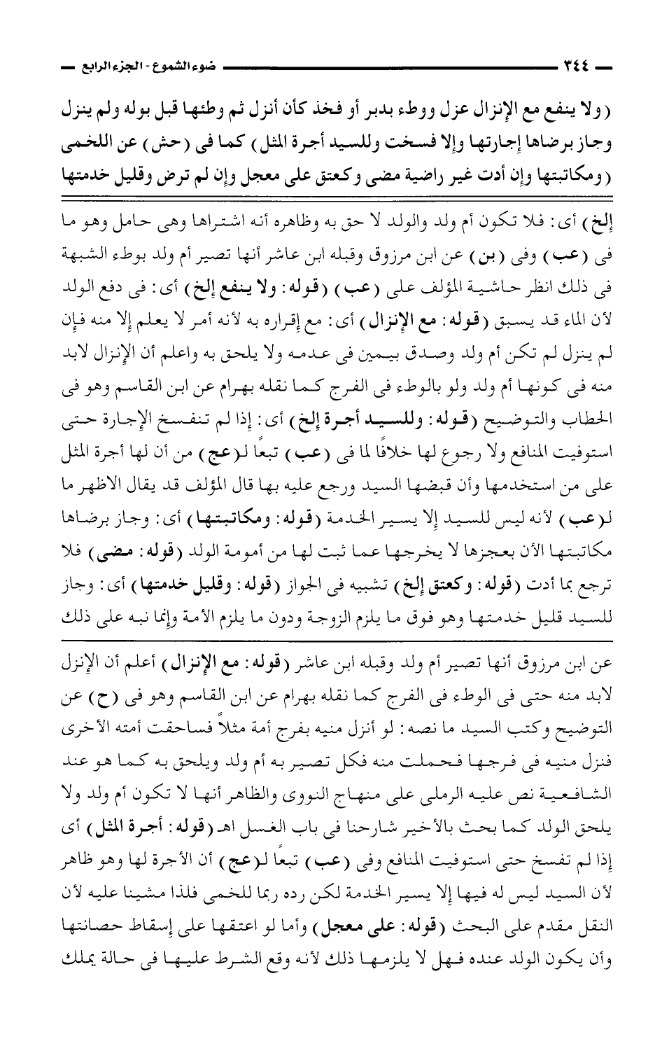 عن ابن مرزوق أنها تصير أم ولد وقبله ابن عاشر (قوله: مع الإنزال) أعلم أن الإنزال لابد منه حتى في الوطء في الفرج كما نقله بهرام عن ابن القاسم وهو في (ح) عن التوضيح وكتب السيد ما نصه: لو أنزل منيه بفرج أمة مثلاً فساحقت أمته الأخرى فنزل منيه في فرجها فحملت منه فكل تصير به أم ولد ويلحق به كما هو عند الشافعية نص عليه الرملي على منهاج النووي والظاهر أنها لا تكون أم ولد ولا يلحق الولد كما بحث بالأخير شارحنا في باب الغسل اهـ (قوله: أجرة المثل) أي إذا لم تفسخ حتى استوفيت المنافع وفي (عب) تبعاً ل (عج) أن الأجرة لها وهو ظاهر لأن السيد ليس له فيها إلا يسير الخدمة لكن رده ربما للخمي فلذا مشينا عليه لأن النقل مقدم على البحث (قوله: على معجل) وأما لو اعتقها على إسقاط حصانتها وأن يكون الولد عنده فهل لا يلزمها ذلك لأنه وقع الشرط عليها في حالة يملك