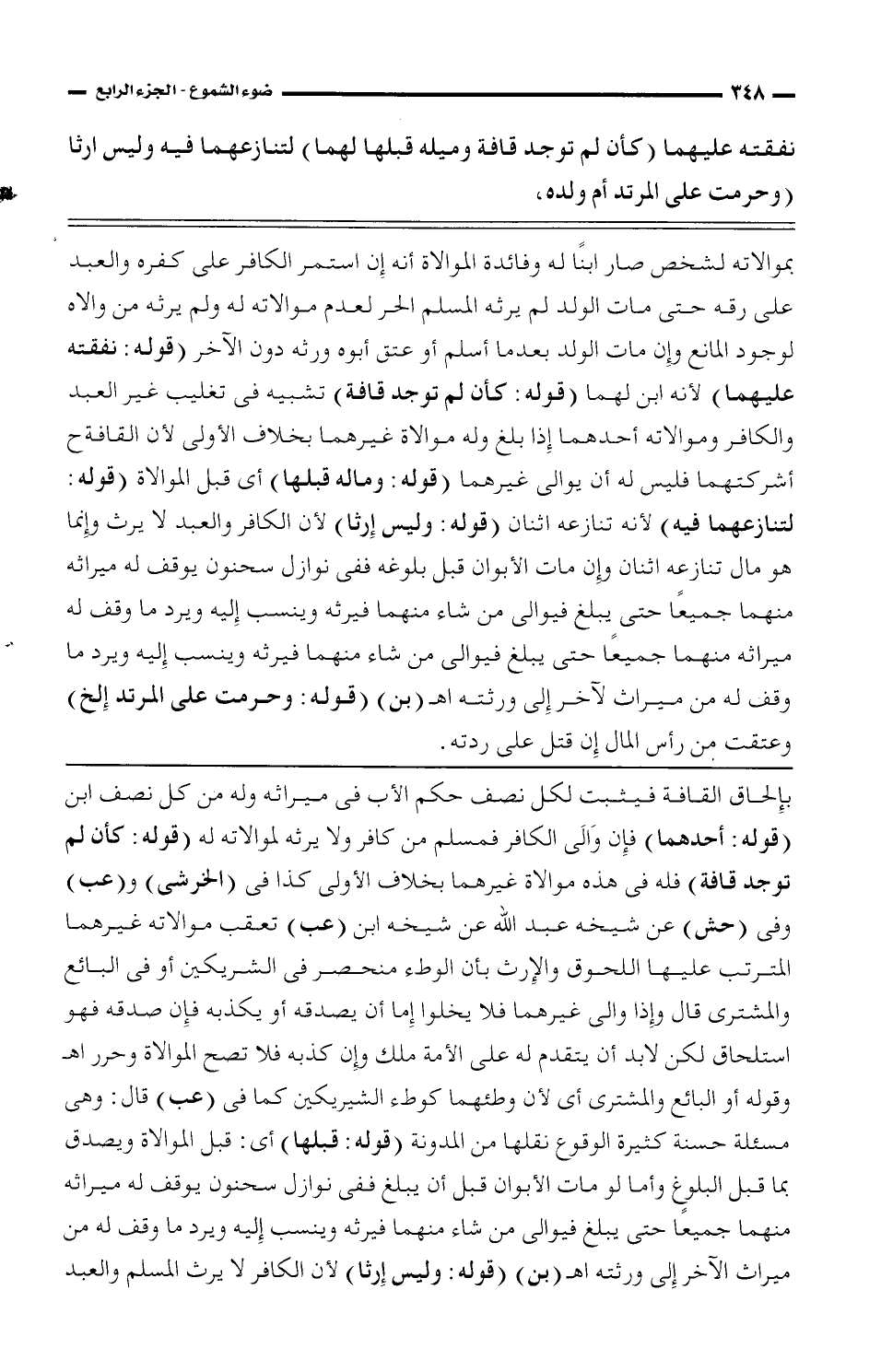 بموالاته لشخص صار ابناً له وفائدة الموالاة أنه إن استمر الكافر على كفره والعبد على رقه حتى مات الولد لم يرثه المسلم الحر لعدم موالاته له ولم يرثه من والاه لوجود المانع وإن مات الولد بعد ما أسلم أو عتق أبوه ورثه دون الآخر (قوله: نفقته عليهما) لأنه ابن لهما (قوله: كأن لم توجد قافة) تشبيه في تغليب غير العبد والكافر وموالاته أحدهما إذا بلغ وله موالاة غيرهما بخلاف الأولى لأن القافة ح أشركتهما فليس له أن يوالى غيرهما (قوله: وماله قبلها) أي قبل الموالاة (قوله: لتنازعهما فيه) لأنه تنازعه اثنان (قوله: وليس إرثا) لأن الكافر والعبد لا يرث وإنما هو مال تنازعه اثنان وإن مات الأبوان قبل بلوغه ففي نوازل سحنون يوقف له ميراثه منهما جميعاً حتى يبلغ فيوالي من شاء منهما فيرثه وينسب إليه ويرد ما وقف له ميراثه منهما جميعاً حتى يبلغ فيوالي من شاء منهما فيرثه وينسب إليه ويرد ما وقف له من ميراث لآخر إلى ورثته اهـ (بن) (قوله: وحرمت على المرتد إلخ) وعتقت من رأس المال إن قتل على ردته.