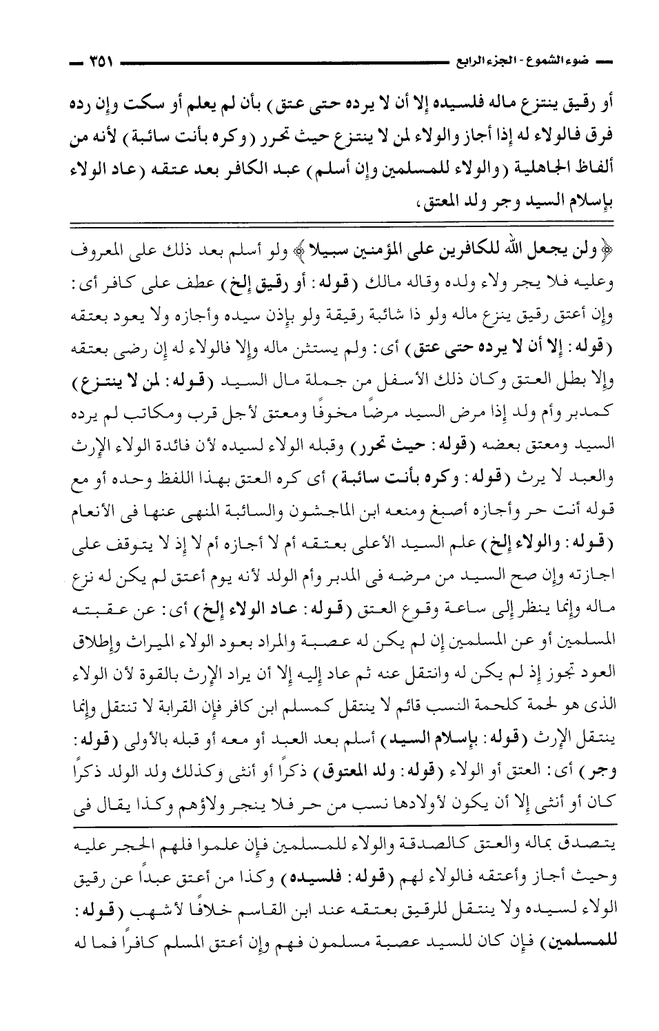 {ولن يجعل الله للكافرين على المؤمنين سبيلا} ولو أسلم بعد ذلك على المعروف وعليه فلا يجر ولاء ولده وقاله مالك (قوله: أو رقيق إلخ) عطف على كافر أي: وإن أعتق رقيق ينزع ماله ولو ذا شائبة رقيقة ولو بإذن سيده وأجازه ولا يعود بعتقه (قوله: إلا أن لا يرده حتى عتق) أي: ولم يستثن ماله وإلا فالولاء له إن رضى بعتقه وإلا بطل العتق وكان ذلك الأسفل من جملة مال السيد (قوله: لمن لا ينتزع) كمدبر وأم ولد إذا مرض السيد مرضاً مخوفاً ومعتق لأجل قرب ومكاتب لم يدره السيد ومعتق بعضه (قوله: حيث تحرر) وقبله الولاء لسيده لأن فائدة الولاء الإرث والعبد لا يرث (قوله: وكره بأنت سائبة) أي كره العتق بهذا اللفظ وحده أو مع قوله أنت حر وأجازه أصبغ منعه ابن الماجشون والسائبة المنهى عنها في الأنعام (قوله: والولاء إلخ) علم السيد الأعلى بعتقه أم لا أجازه أم لا إذ لا يتوقف على إجازته وإن صح السيد من مرضه في المدبر وأم الولد لأنه يوم أعتق لم يكن له نزع ماله وإنما ينظر إلى ساعة وقوع العتق (قوله: عاد الولاء إلخ) أي: عن عقبته المسلمين أو عن المسلمين إن لم يكن له عصبة والمراد بعود الولاء الميراث وإطلاق العود تجوز إذ لم يكن ل وانتقل عنه ثم عاد إليه إلا أن يراد الإرث بالقوة لأن الولاء الذي هو لحمة كلحمة النسب قائم لا ينتقل كمسلم ابن كافر فإن القرابة لا تنتقل وإنما ينتقل الإرث (قوله: بإسلام السيد) أسلم بعد العبد أو معه أو قبله بالأولى (قوله: وجر) أي: العتق أو الولاء (قوله: ولد المعتوق) ذكراً أو أنثى وكذلك ولد الولد ذكراً كان أو الأنثى إلا أن يكون لأولادها نسب من حر فلا ينجر ولاؤهم وكذا يقال في