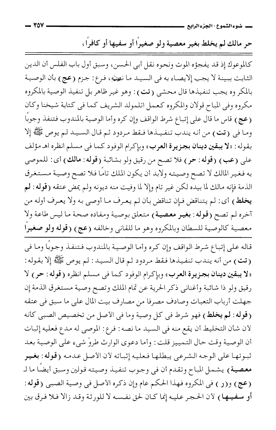 قاله على إتباع شرط الواقف وإن كره وأما الوصية بالمندوب فتنفذ وجوبا وما (تت) من أنه يندب تنفيذها فقط مردود ثم قال السيد: لم يوص صلى الله عليه وسلم إلا بقوله: «لا يبقين دينان بجزيرة العرب» وبإكرام الوفود كما في مسلم انظره (قوله: حر) لا رقيق ولو ذا شائبة وأغناني ذكر الحرية عن تمام الملك وتصح وصية مستغرق الذمة إن جهلت أرباب التعبات وصادف مصرفا من مصارف بيت المال على ما سبق في عتقه (قوله: لم يخلط) فهو شرط في كل وصية وما في الأصل من تخصيص الصبي كأنه لأن شأن التخليط أن يقع منه في السيد ما نصه: فرع: الموصى له مدع فعليه إثبات أن الوصية وقت حال التمييز قلت: وأما دعوى الوارث طرو شيء على الوصية بعد ثبوتها على الوجه الشرعي يبطلها فعليه إثباته لأن الأصل عدمه (قوله: بغير معصية) يشمل المباح وتقدم أن في وجوب تنفيذ وصيته قولين وسبق أيضا ما ل (عج) و (ر) في المكروه فهذا الحكم عام وإن ذكره الأصل في وصية الصبي (قوله: أو سفيها) لأن الحجر عليه إنما كان لحق نفسه لا للورثة وقد زالا فلا فرق بين