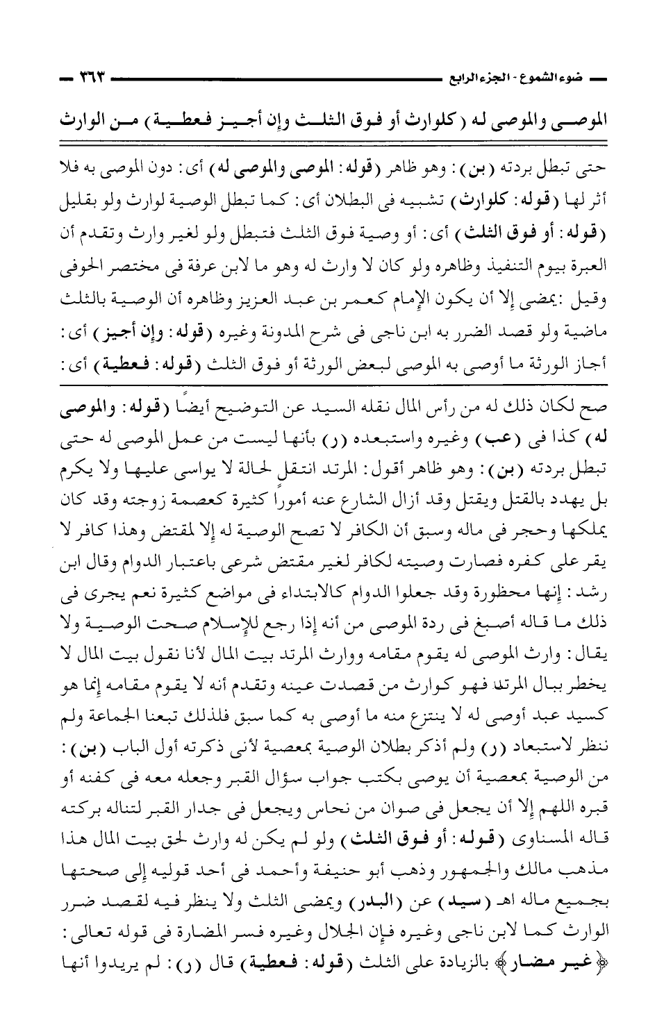 صح لكان ذلك له من رأس المال نقله السيد عن التوضيح أيضاً (قوله: والموصى له) كذا في (عب) وغيره واستبعده (ر) بأنها ليست من عمل الموصى له حتى تبطل بردته (بن): وهو ظاهر أقول: المرتد انتقل لحالة لا يواسي عليها ولا يكوم بل يهدد بالقتل ويقتل وقد أزال الشارع عنه أموراً كثيرة كعصمة زوجته وقد كان يملكها وحجر في ماله وسبق أن الكافر لا تصح الوصية له إلا لمقتض وهذا وهذا كافر لا يقر على كفرة فصارت وصيته لكافر لغير مقتض شرعي باعتبار الدوام وقال ابن رشد: إنها محظورة وقد جعلوا الدوام كالابتداء في مواضع كثيرة نعم يجري في ذلك ما قاله أصبغ في ردة الموصى من أنه إذا رجع للإسلام صحت الوصية ولا يقال: وارث الموصى له يقوم مقامه ووارث المرتد بيت المال لأنا نقول بيت المال لا يخطر ببال المرتد فهو كوارث من قصدت عينه وتقدم أنه لا يقوم مقامه إنما هو كسيد لاستبعاد (ر) ولم أذكر بطلان الوصية بمعصية لأني ذكرته أول الباب (بن): من الوصية بمعصية أن يوصى بكتب جواب سؤال القبر وجعله معه في كفنه أو قبره اللهم إلا أن يجعل في صوان من نحاس ويجعل في جدار القبر لتناله بركته قاله المسناوي (قوله: أو فوق الثلث) ولو لم وارث كما لابن ناجي وغيره فإن الجلال وغيره فسر المضارة في قوله تعالى: {غير مضار} بالزيادة على الثلث (قوله: فعطية) قال (ر): لم يريدوا أنها