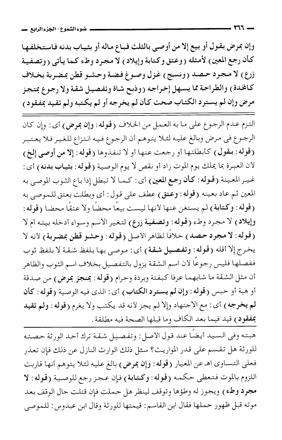 وإن بمرض بقول أو بيع إلا من أوصى بالثلث فباع ماله أو بثياب بدنه فاستخلفها كأن رجع المعين) لأمثله (وعتق وكتابة وإيلاد) لا مجرد وطء كما يأتي (وتصفية زرع) لا مجرد حصد (ونسج) غزل وصوغ فضة وحشو قطن بمضربة بخلاف كالمخدة) والطراحة مما يسهل إخراجه (وذبح شاة وتفصيل شقة ولا رجوع بمتجز مرض وإن لم يسترد الكتاب صحت كأن لم يخرجه أو لم يكتبه ولم تقيد بمفقود)