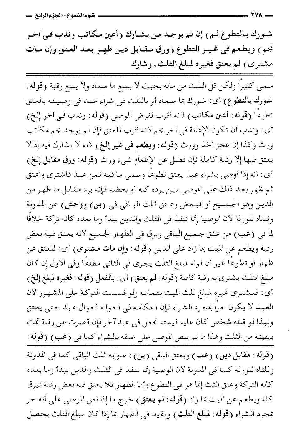 سمي كثيرًا ولكن قل الثلث من ماله بحيث لا يسع ما سماه ولا يسع رقبة (قوله: شورك بالتطوع) أي: شورك بما سماه أو بالثلث في شراء عبد في وصيته بالعتق تطوعًا (قوله: أعين مكاتب) لأنه أقرب لفرض الموصي (قوله: وندب في آخر الخ) أي: وندب أن تكون الإعانة في آخر نجم لأنه أقرب للعتق فإن لم يوجد نجم مكاتب ورث وكذا إن عجز أخذ وورث (قوله: ويطعم في غير الخ) لأنه لا يشارك فيه إذا لا يعتق فيها إلا رقبة كاملة فإن فضل عن الإطعام شيء ورث (قوله: ورق مقابل الخ) أي: أنه إذا أوصى بشراء عبد يعتق تطوعًا وسمي ما فيه ثمن عبد فاشترى واعتق ثم ظهر بعد ذلك على الموصي دين يرده كله أو بعضه فإنه يرد مقابل ما ظهر من الدين وهو الجميع أو البعض وعتق ثلث الباقي في (بن) و (حش) عن المدونة وثلثاه للورثة لأن الوصية إنما تنفذ في الثلث والدين يبدأ وما بعده كأنه تركة خلافًا لما في (عب) من عتق جميع الباقي ويرق في الظهار الجميع لأنه يعتق فيه بعض رقبة ويطعم عن الميت بما زاد على الدين (قوله: وإن مات مشتري) أي: للعتق عن ظهار أو تطوعًا غير أن قوله لمبلغ الثلث يجري في الثاني مطلقًا وفي الأول إن كان مبلغ الثلث يشتري به رقبة كاملة (قوله: لم يعتق) أي: (قوله: فغيره لمبلغ الخ) أي: فيشري غيره لمبلغ ثلث الميت بتمامه ولو قسمت التركة على المشهور لأن العبد لا يكون حرًا بمجرد الشراء فإن أحكامه في أحواله أحوال عبد حتى يعتق ولهذا لو قتله شخص كان عليه قيمته تجعل في عبد آخر فإن قصرت عن رقبة تمت ببقية من الثلث وهذا ما لم ينص الموصي على عتقه بالشراء كما في (عب) (قوله: